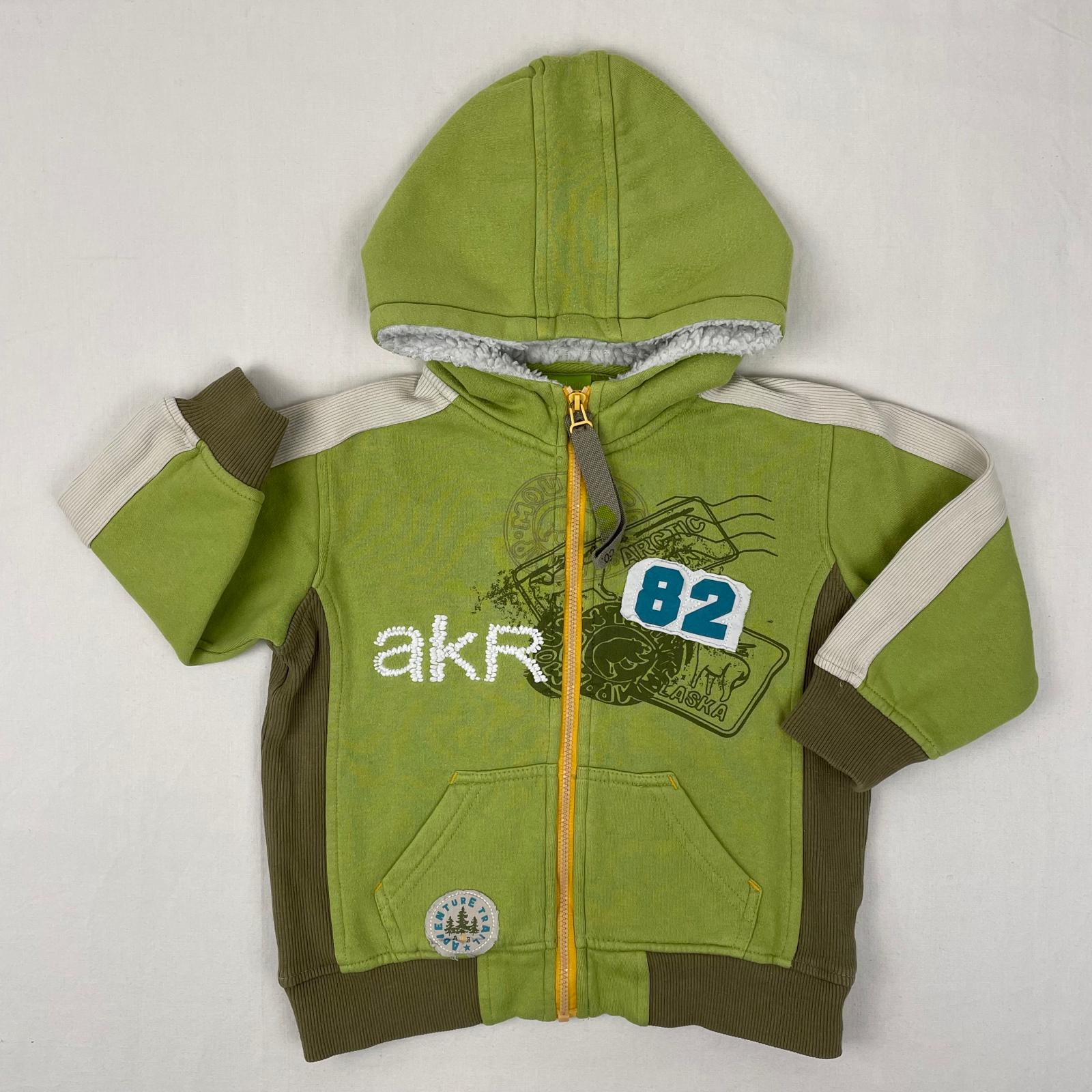 Autres commentaires : 35% polyester. Sweat à capuche vert avec imprimé voyage, inscription « Akr » et « 82 » en relief. Fermeture par zip.