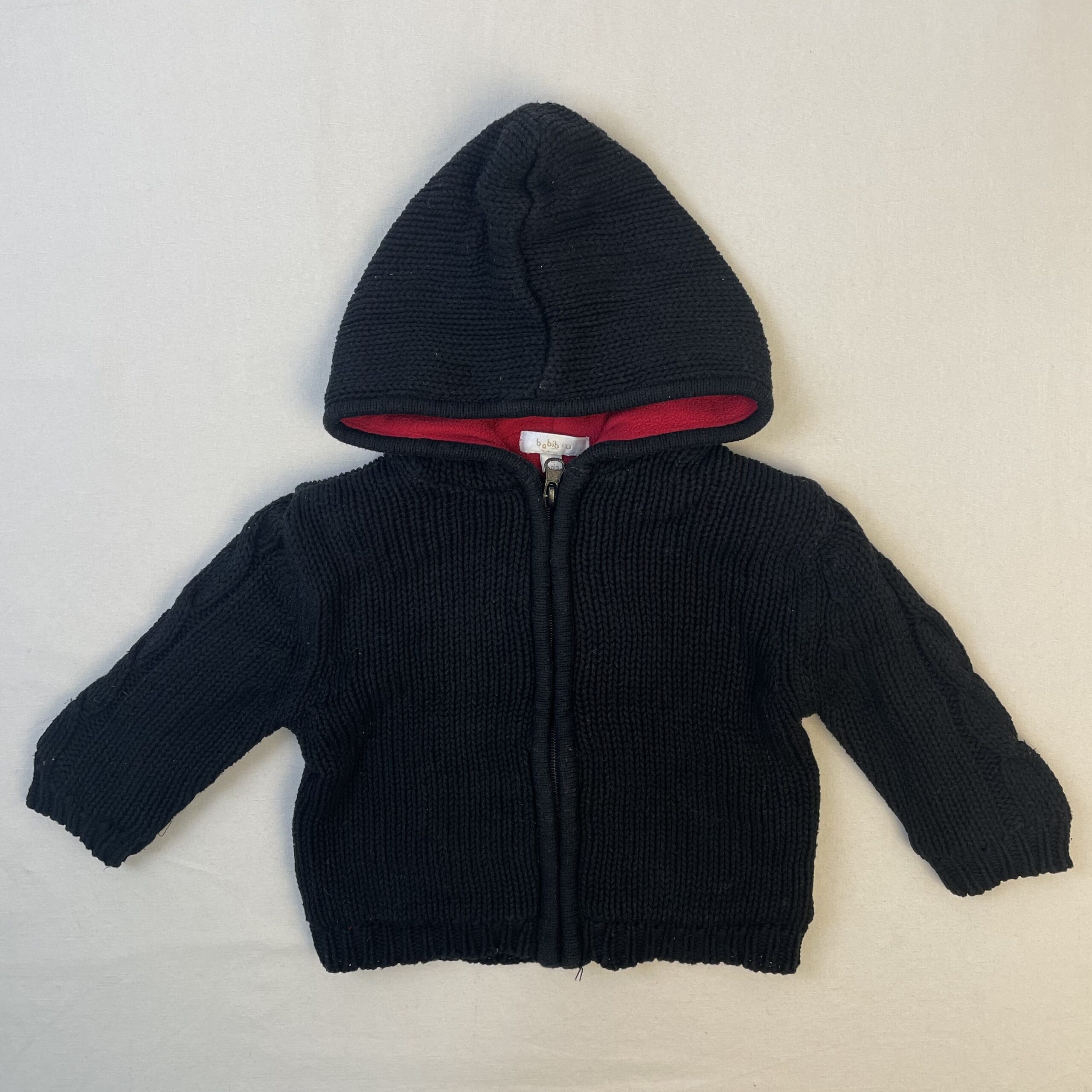 - Gilet zippé en tricot à capuche, doublure molletonnée rouge.