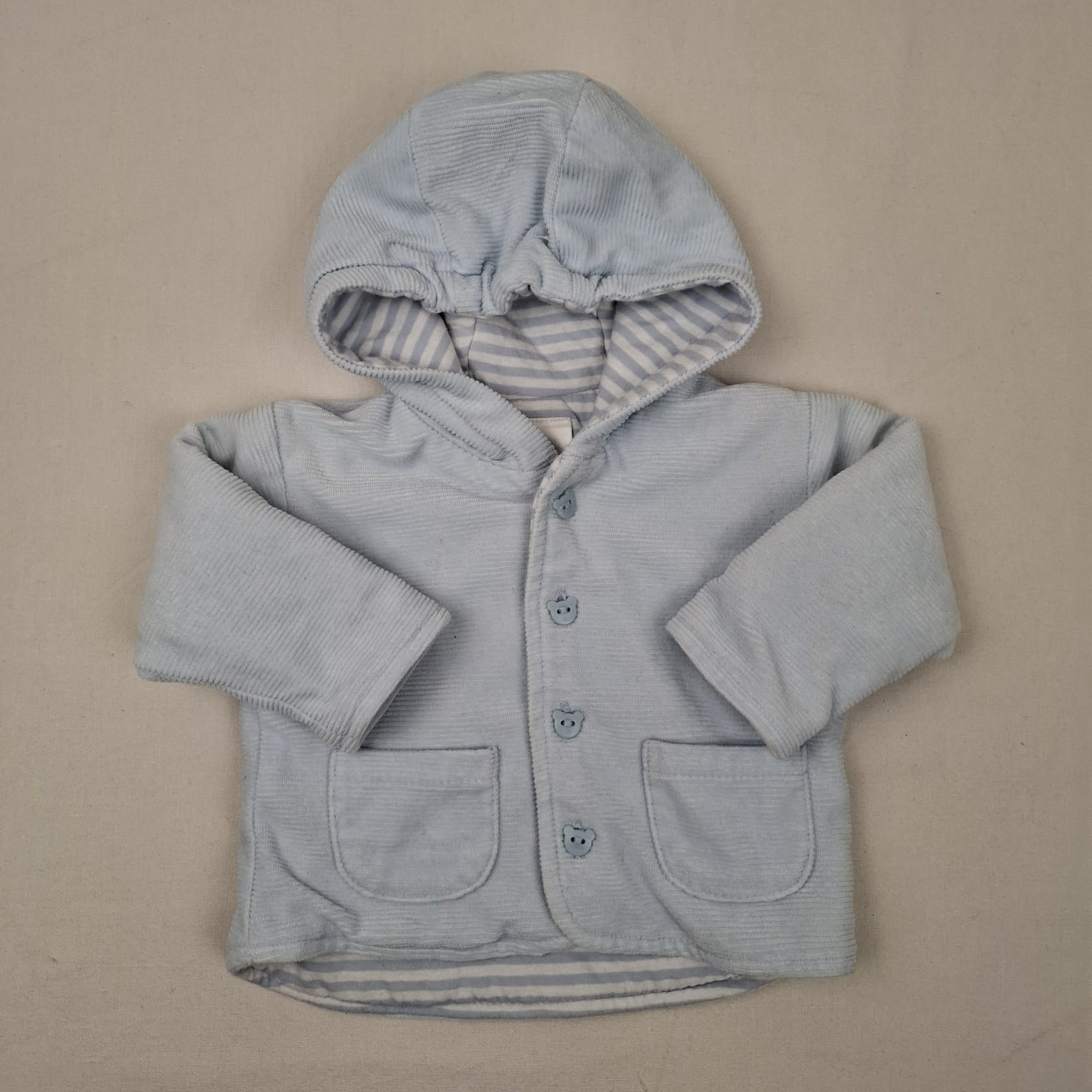 Autres commentaires : 40% coton. Gilet bleu clair en velours côtelé avec capuche, fermeture par boutons, 2 poches plaquées, doublure en coton 100%, garnissage 100% polyester.