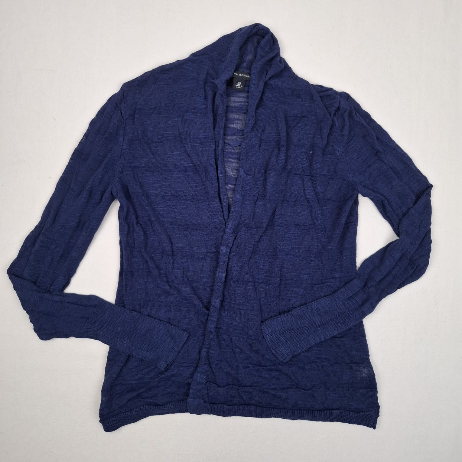 Autres commentaires : 10% nylon. Gilet bleu foncé ouvert et fin, taille XS.