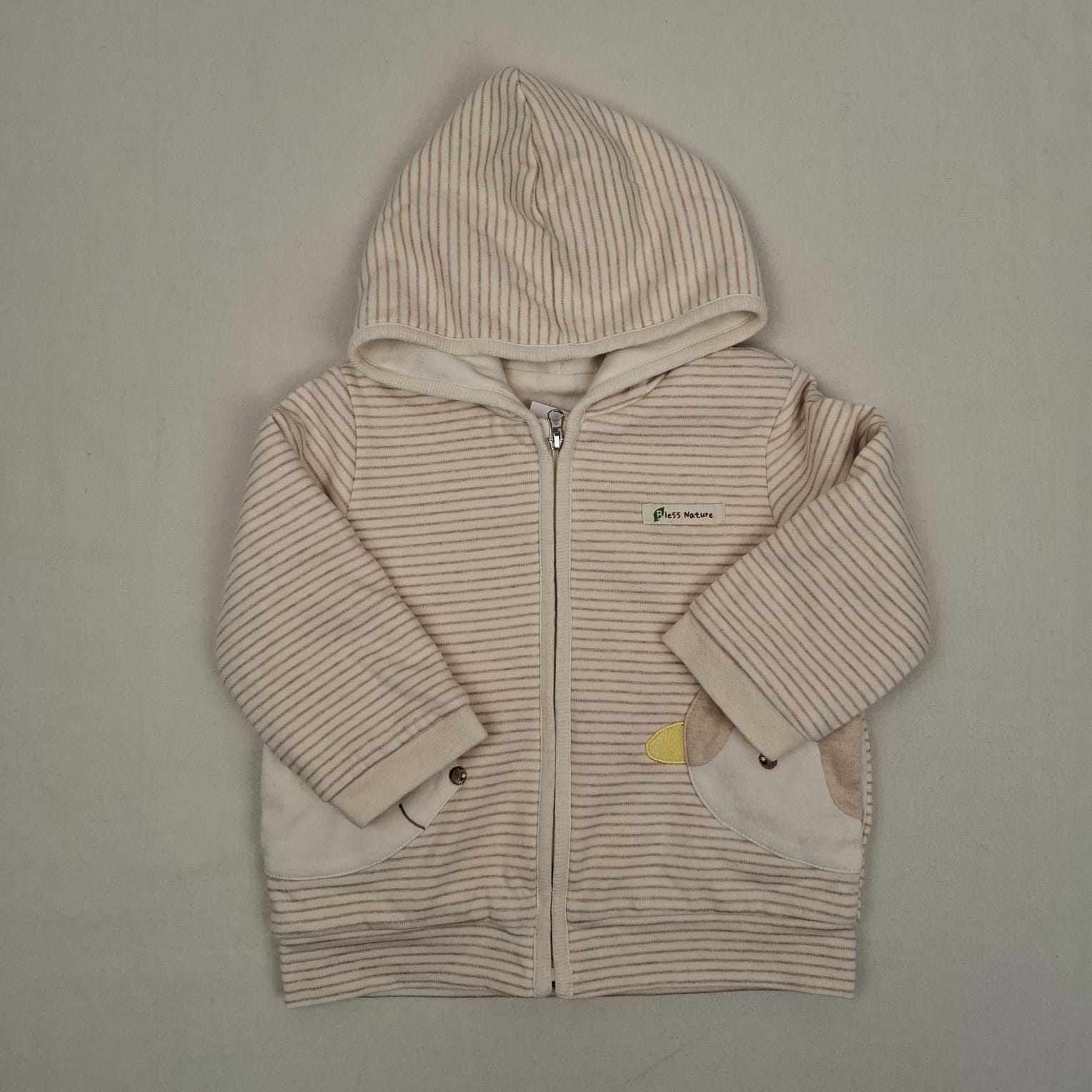 Autres commentaires : Gilet sweat chaud à capuche, couleur crème à rayures marron, à capuche, zippé devant, doublure ouatinée et en tissu crème uni, motifs pinguoin et ours polaire sur le devant.