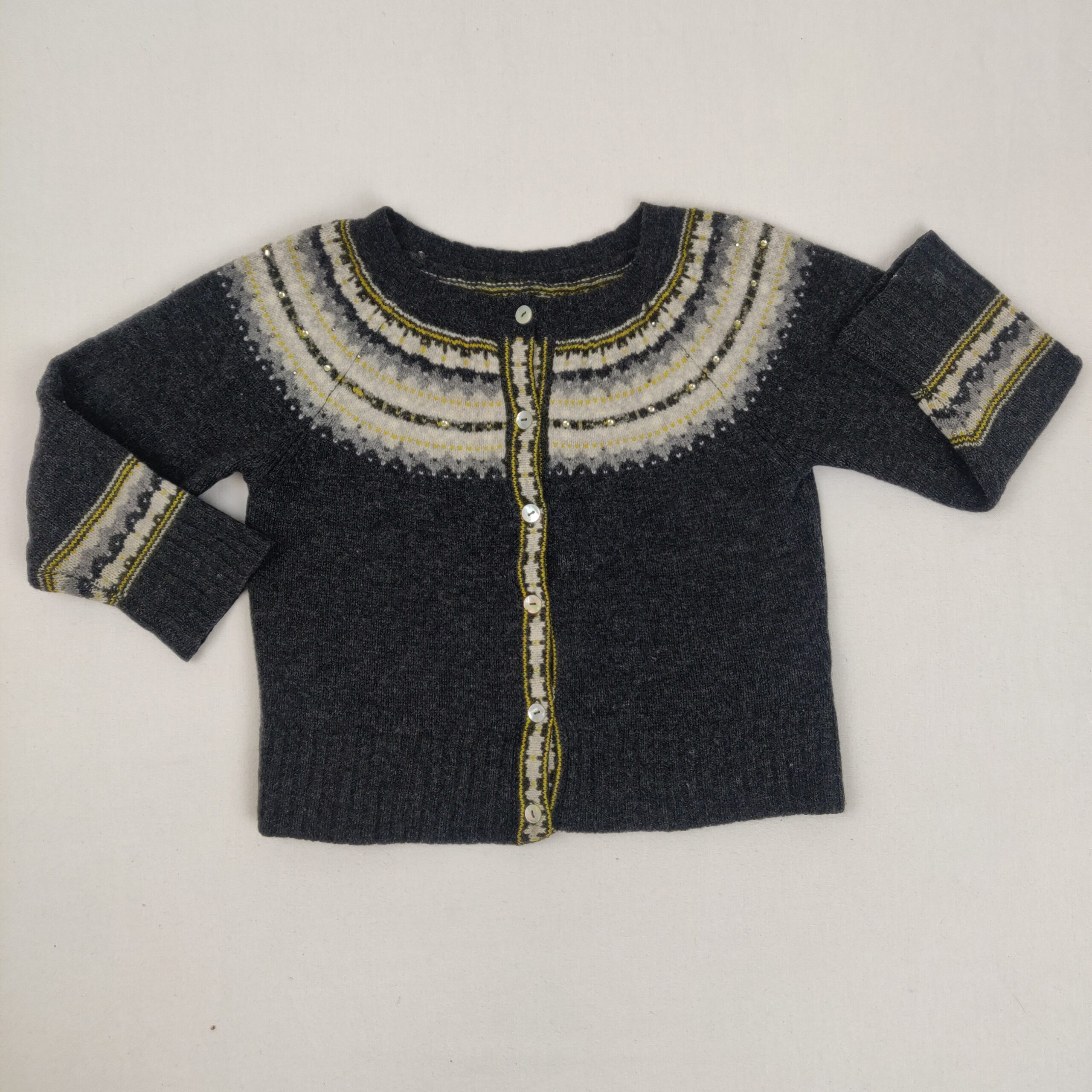 Autres commentaires : Gilet chaud en laine merinos, gris anthracite, col rond, boutons nacrés. L’étiquette de la marque est manquante mais la marque est indiquée sur l’étiquette de la matière. Taille estimée 3A. Petits défauts : reprises très discrètes au niveau de l’étiquette au col, ainsi qu’à deux endroits. Niveau réduit de Melon à Kiwi.