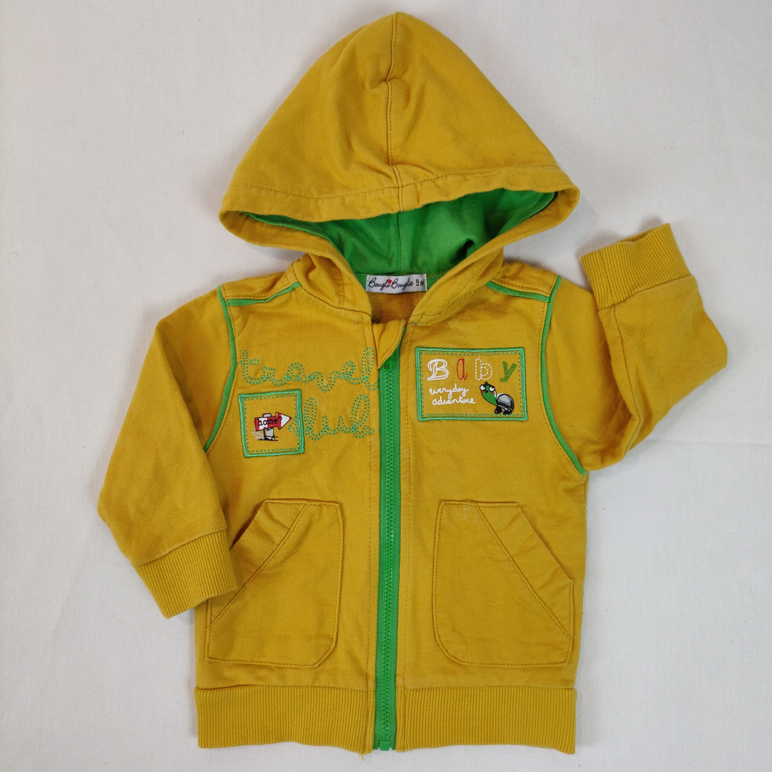 Autres commentaires : Gilet à capuche – jaune avec liserés verts sur les manches (2 petits accros reprisés et micro tâche au dos). Ouverture centrale à fermeture éclair verte. 2 poches latérales.