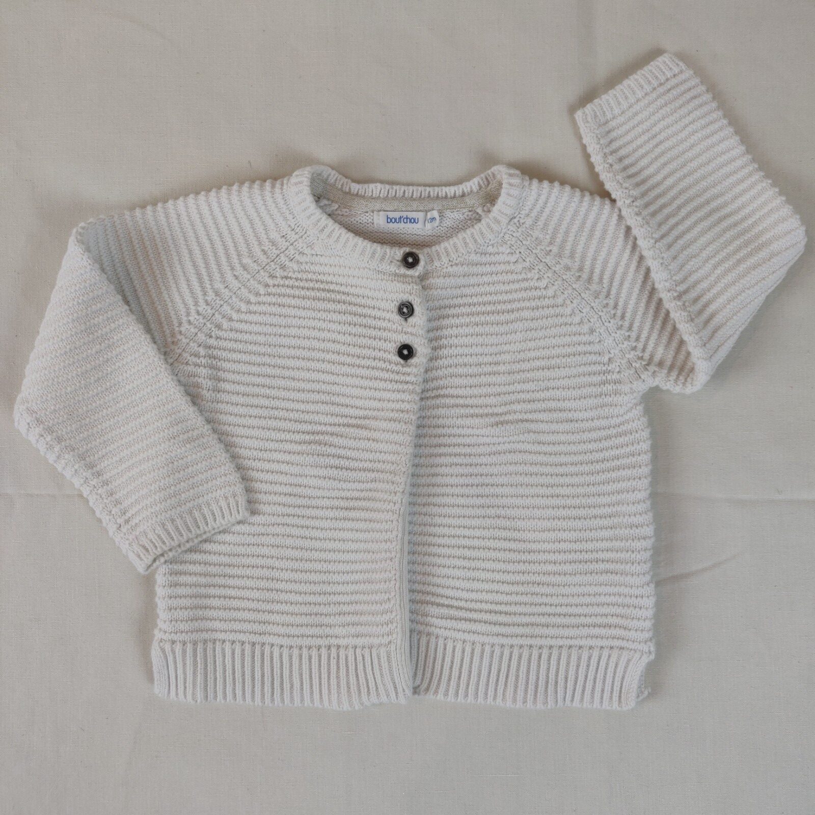 Autres commentaires : Gilet – écru – en maille côtelée horizontale. Ouverture centrale à 3 boutons classiques uniquement en partie supérieure.