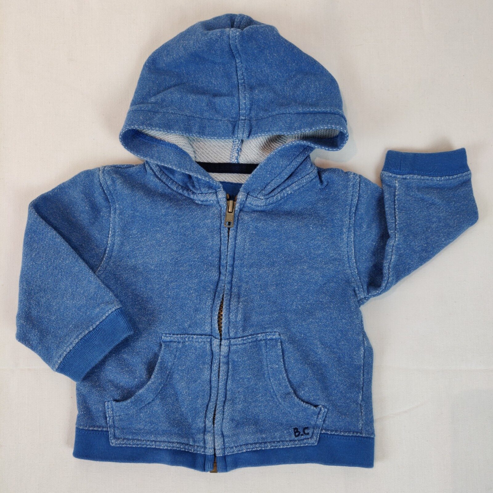 Autres commentaires : 1% viscose. Gilet à capuche – bleu chiné – ouverture centrale à fermeture éclair. Grande poche centrale à double ouverture. Taille et poignets élastiques façon tricot.