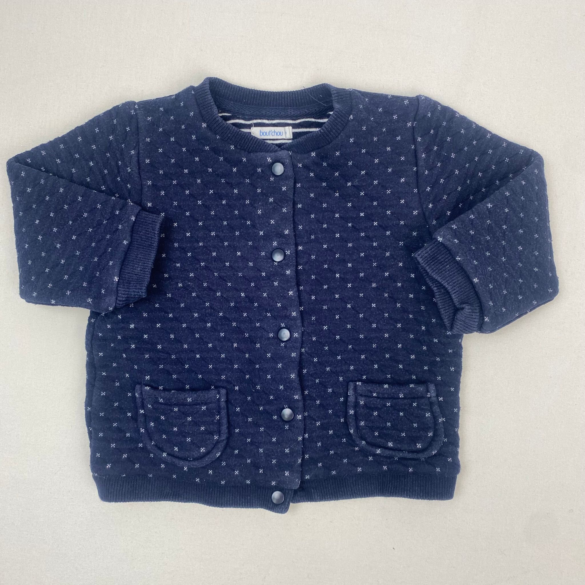 Autres commentaires : 2% élasthanne sur les bords cotés, Gilet bleu foncé à manches longues avec des croix blanches, col rond, fermeture par boutons pressions, petit défaut : il manque un bouton