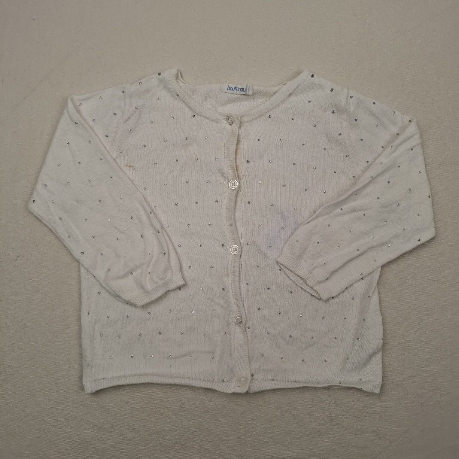 Autres commentaires : Gilet en maille blanc à pois argentés, col rond, finition bord-côte au col, poignets et à la base, petite tache devant.