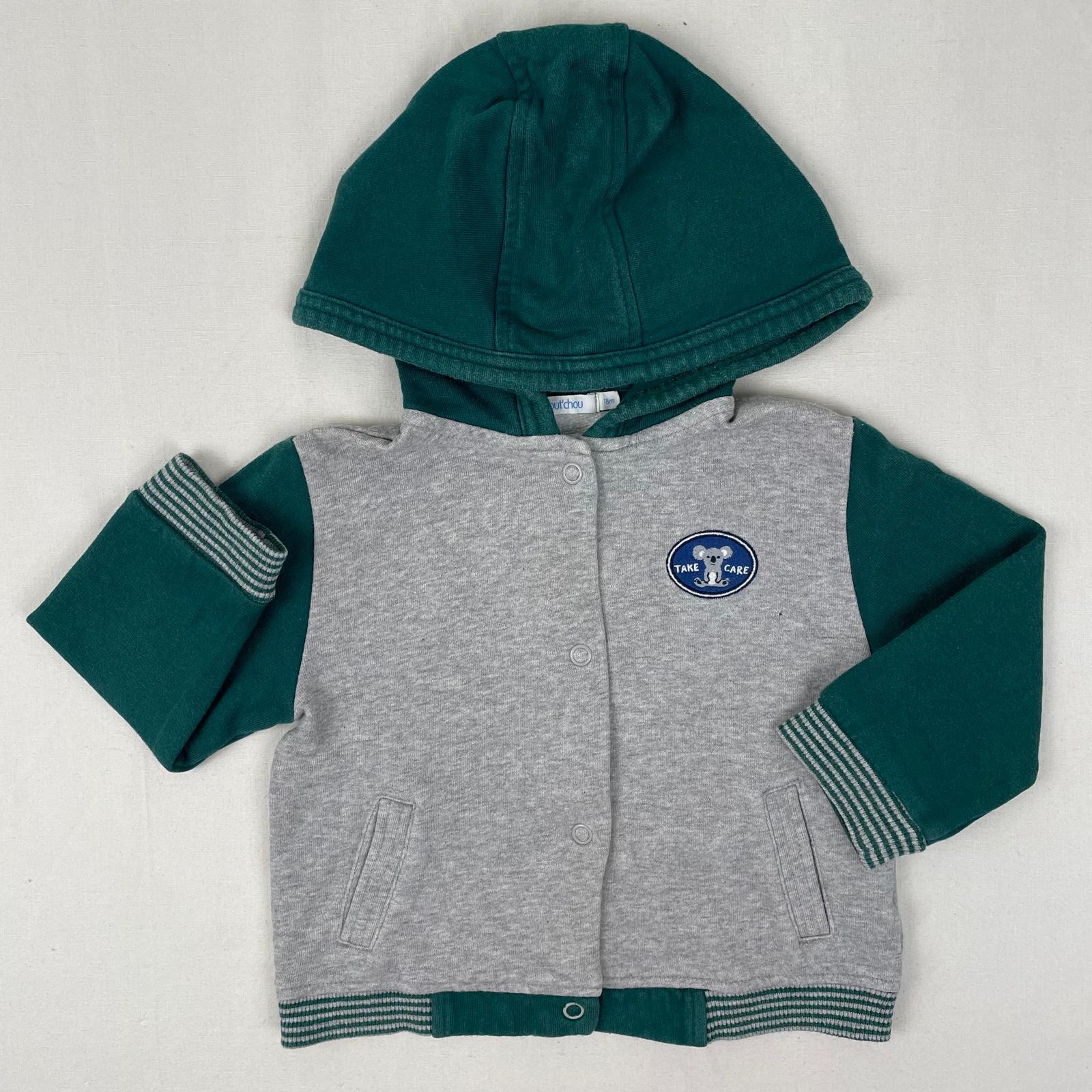Gilet gris à boutons pression, manches et capuche vert sapin, avec écusson motif koala et inscription « Take care » côté cœur. Petit accro réparé, quasiment invisible.