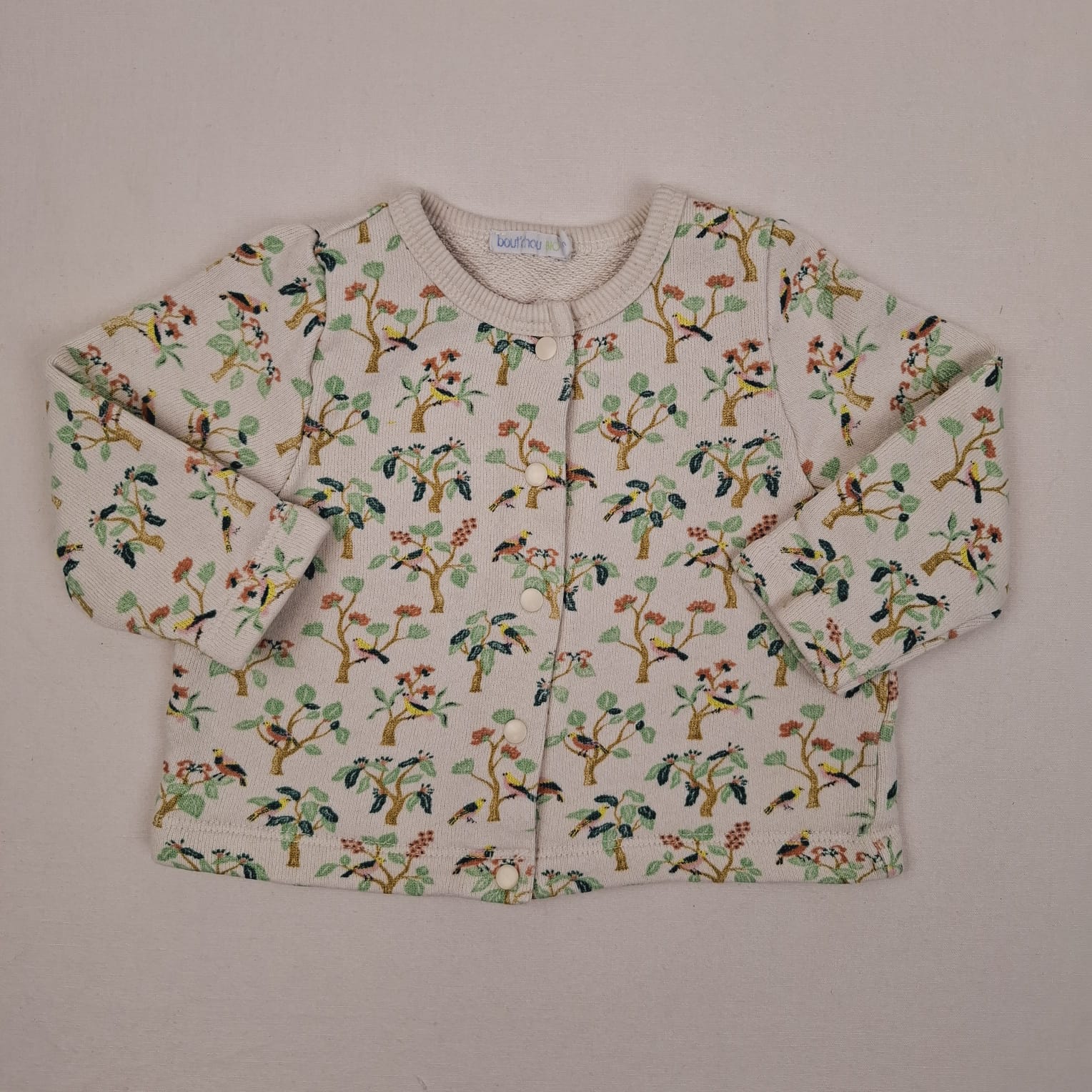 Autres commentaires : Gilet Bout’chou beige, 6mois, motifs d’abre avec perroquet sur tout le vêtement, ouverture par boutons pression.