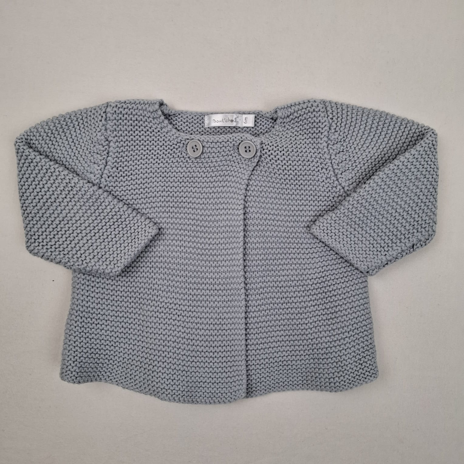 Autres commentaires : 15% laine.Gilet point mousse bleu clair , fermeture par 2 boutons à l’avant.