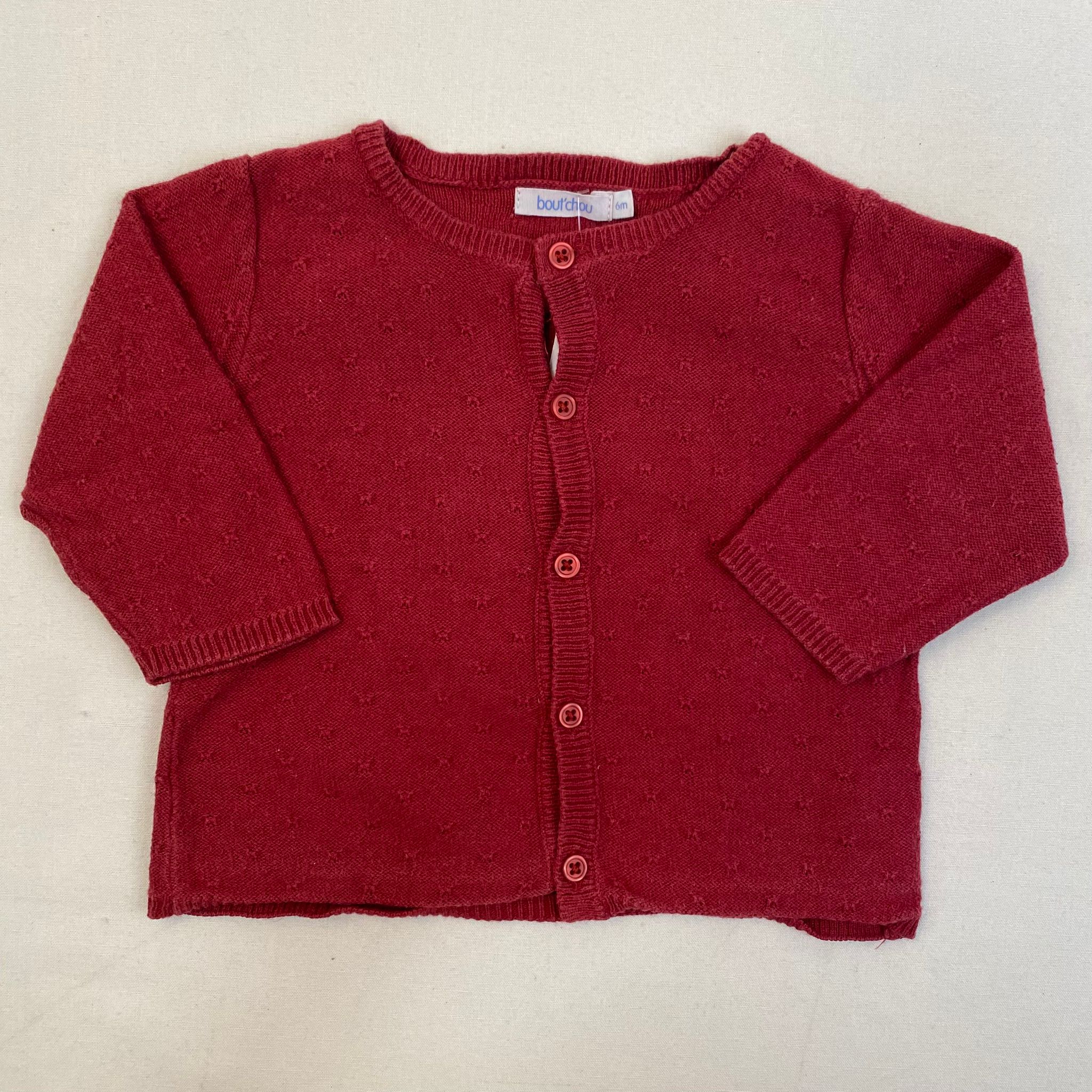 15% laine. Gilet rouge, col rond, fermeture par boutons.