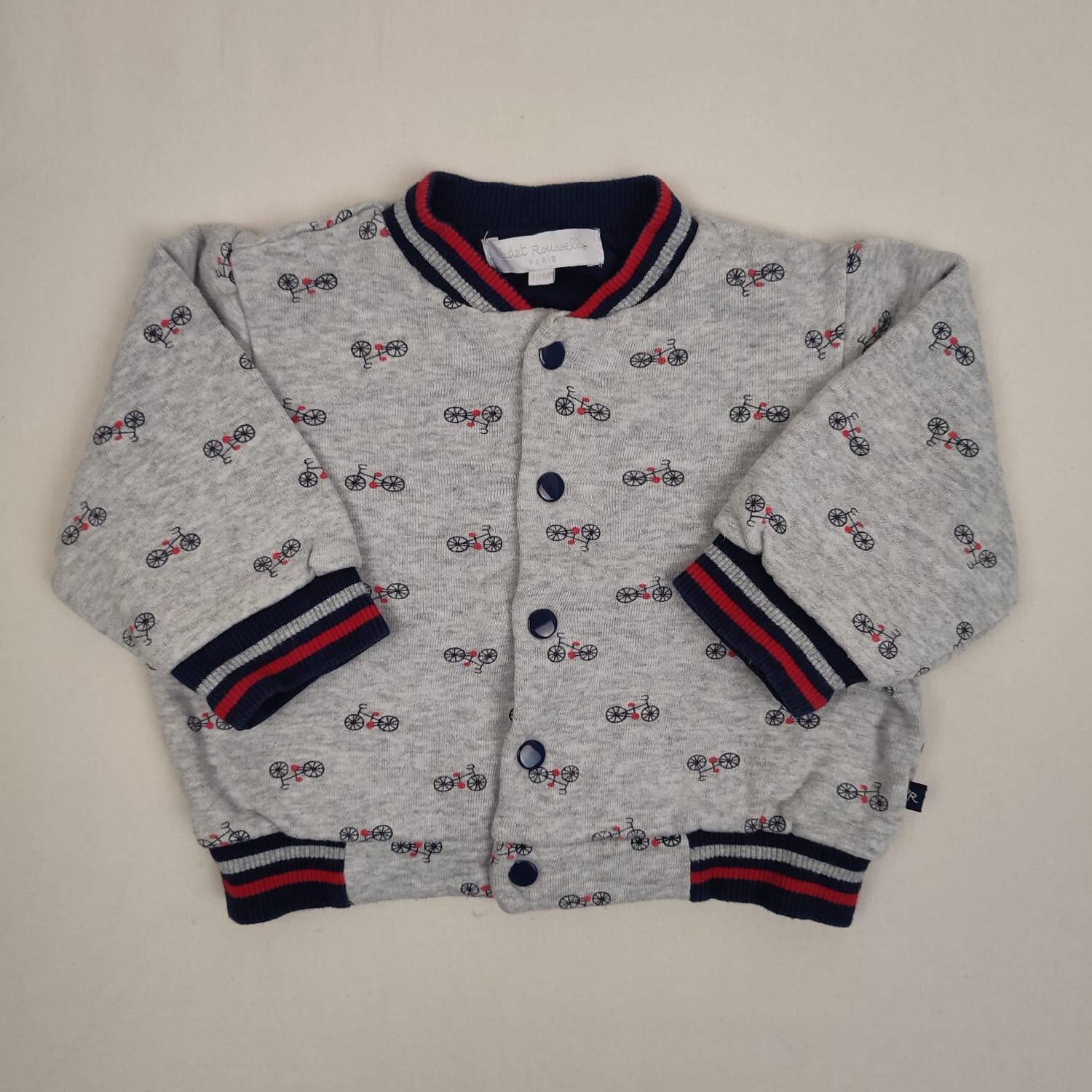 Autres commentaires : Gilet manches longues gris, bords côtes rayés bleus et rouges, doublure 100% coton, motif mini vélos sur l’entiéreté de la pièce, fermeture devant par boutons pressions.