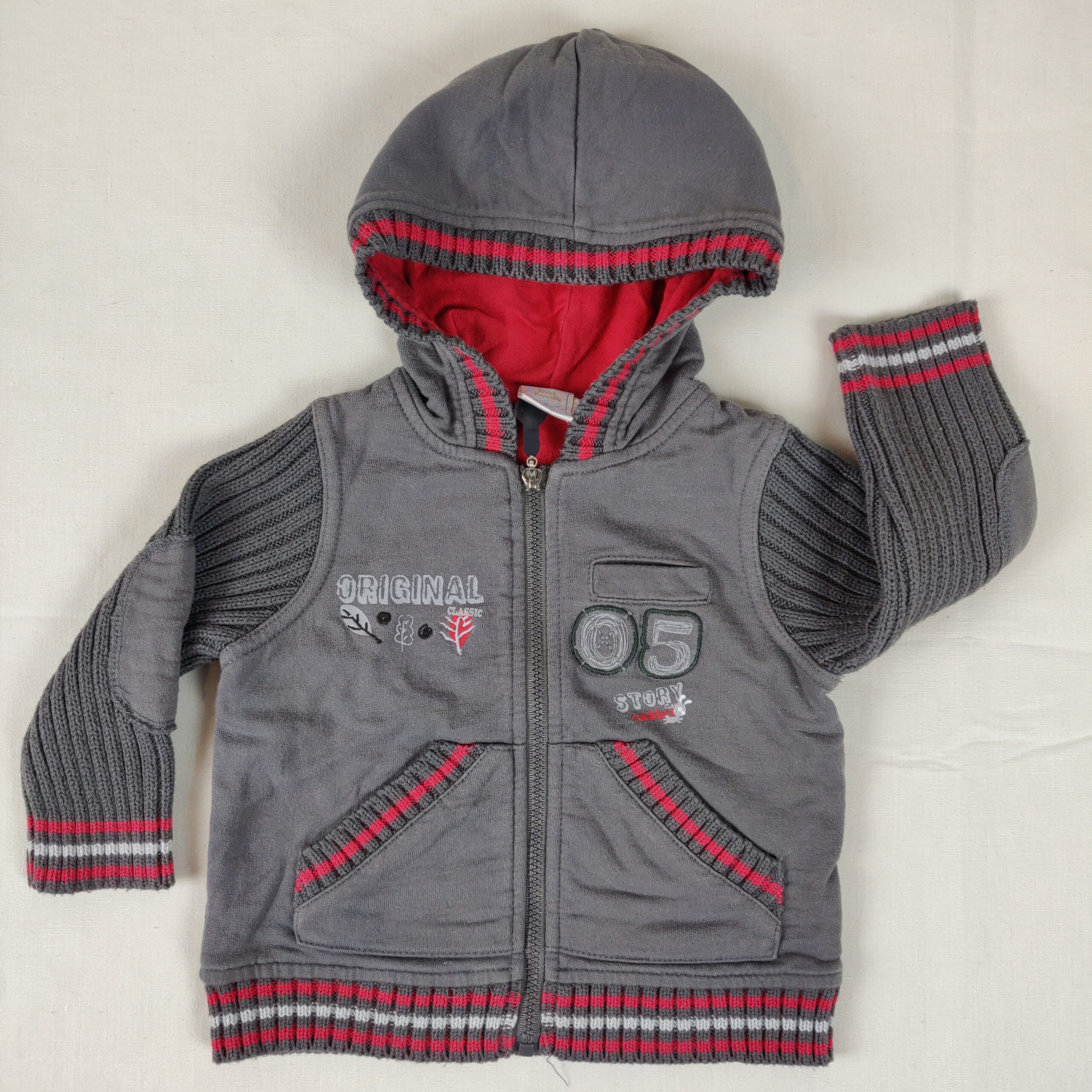 Autres commentaires : Gilet gris foncé à capuche. Doublure intérieure rouge. Manches façon tricot avec empiècement sur les coudes. 2 poches avant. Diverses inscriptions sur le devant. Femeture élair. Rebord capuche, manches et taille avec des rayures rouges et blanches façon tricot.
