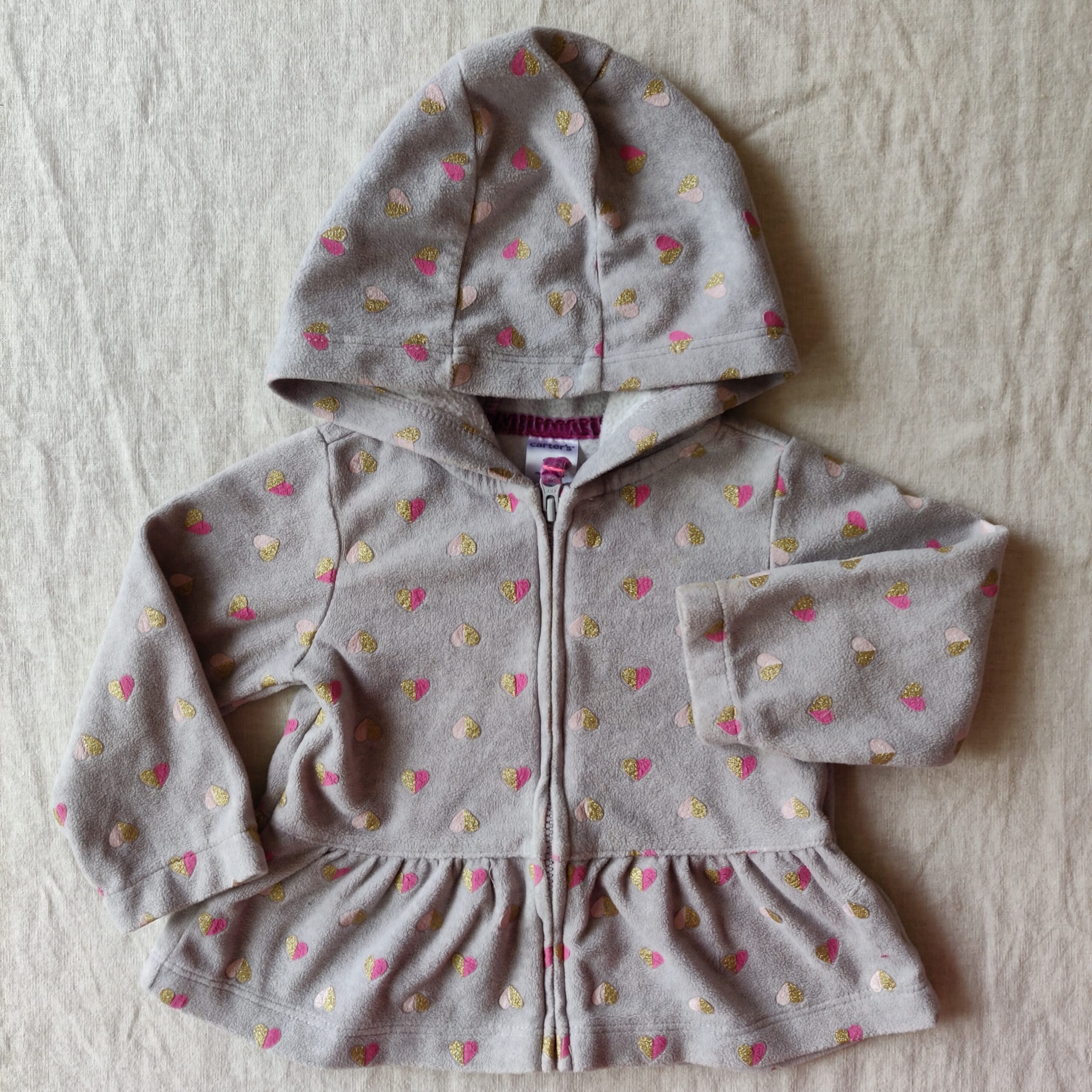 Autres commentaires : Gilet à capuche en polaire, coeurs roses et dorés sur fond gris. Fermeture par zip.