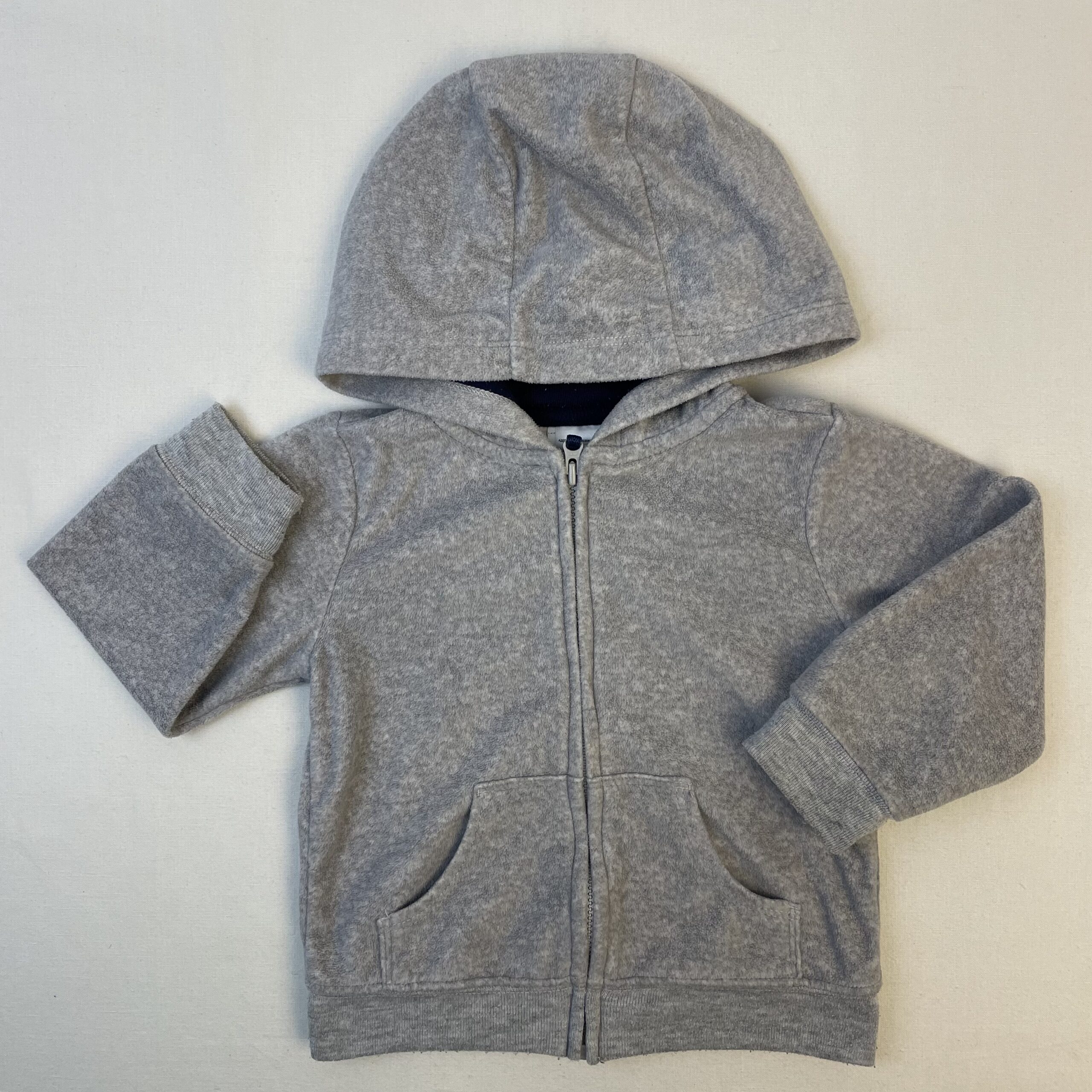 - Gilet en tissu doux gris clair zippé à capuche, doublure de la capuche bleu marine.