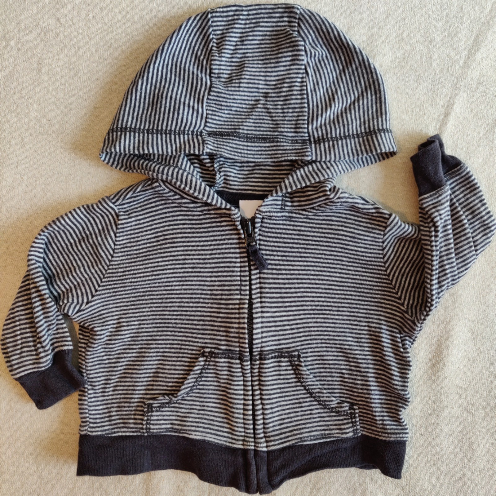 Autres commentaires : Gilet à capuche noir et gris à fines rayures. Non doublé, fermeture par zip, deux poches à l’avant.