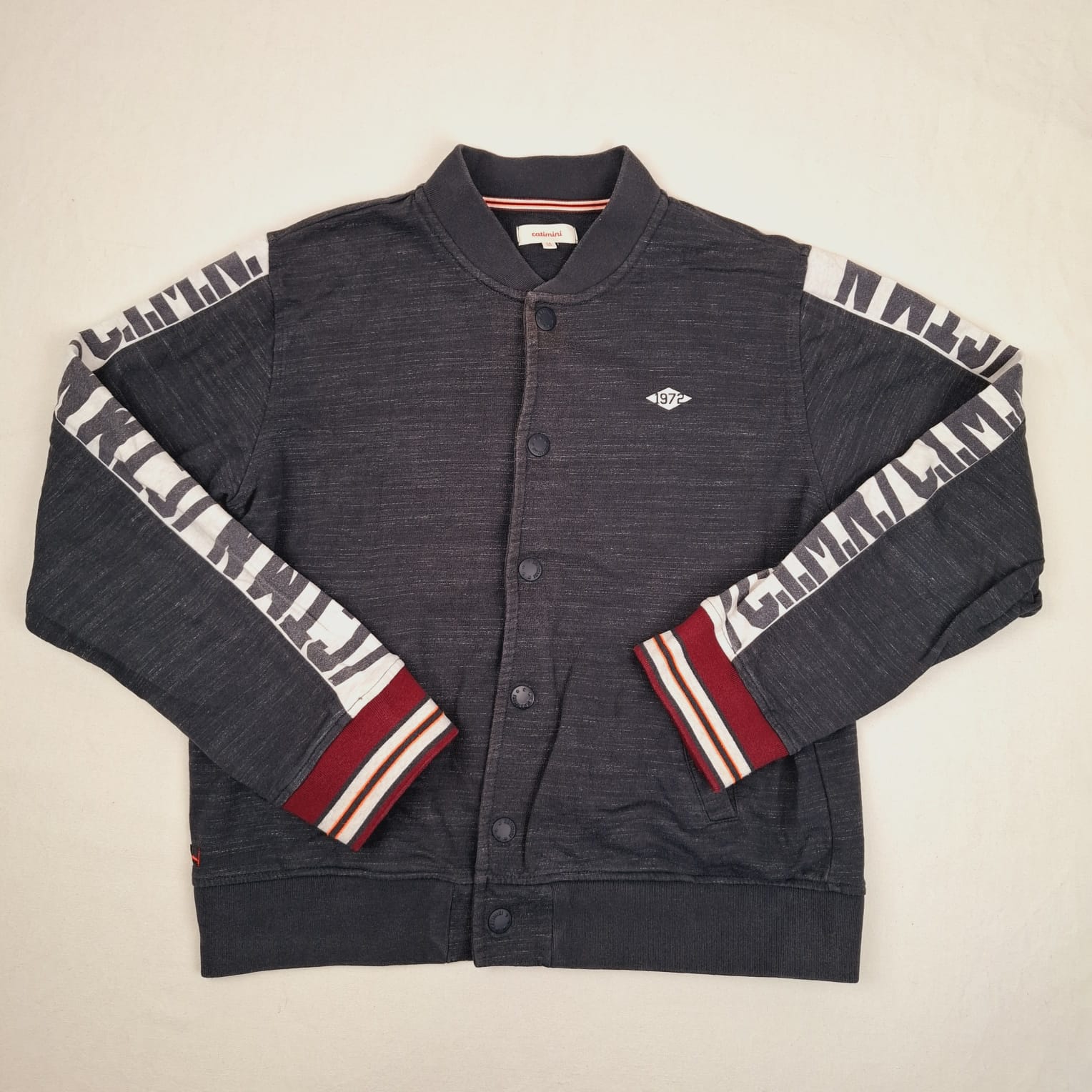 Autres commentaires : 10% viscose, 3% polyester. Gilet teddy gris, poche kangourou, poignets, taille et col côtelés, fermeture par boutons pression, col teddy, inscription « C.T.M.N. » sur les manches.