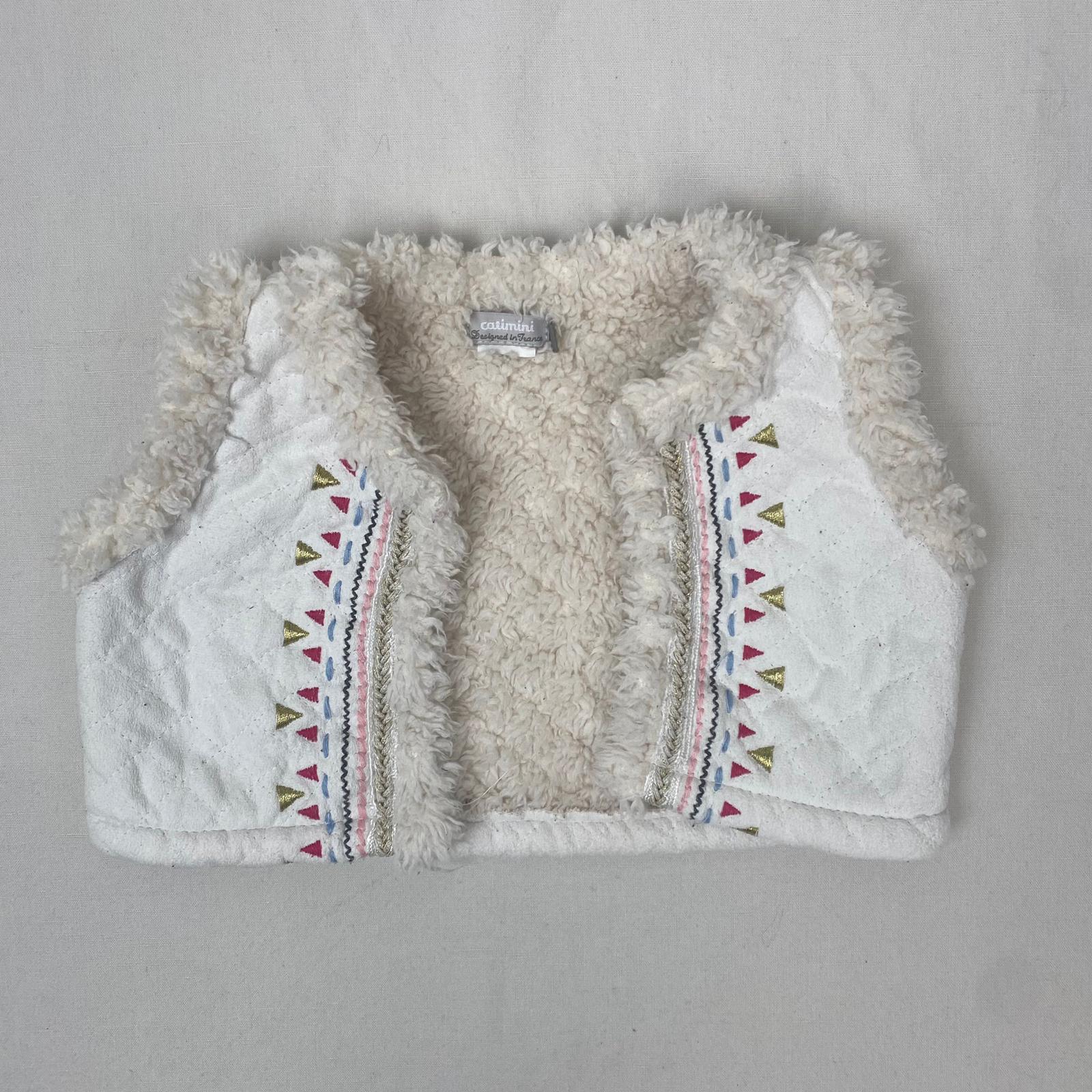 Autres commentaires : Gilet blanc cassé sans manches CATIMINI, bordures et doublure en fourrure synthétique, avec devant des frises géométriques colorées verticales.