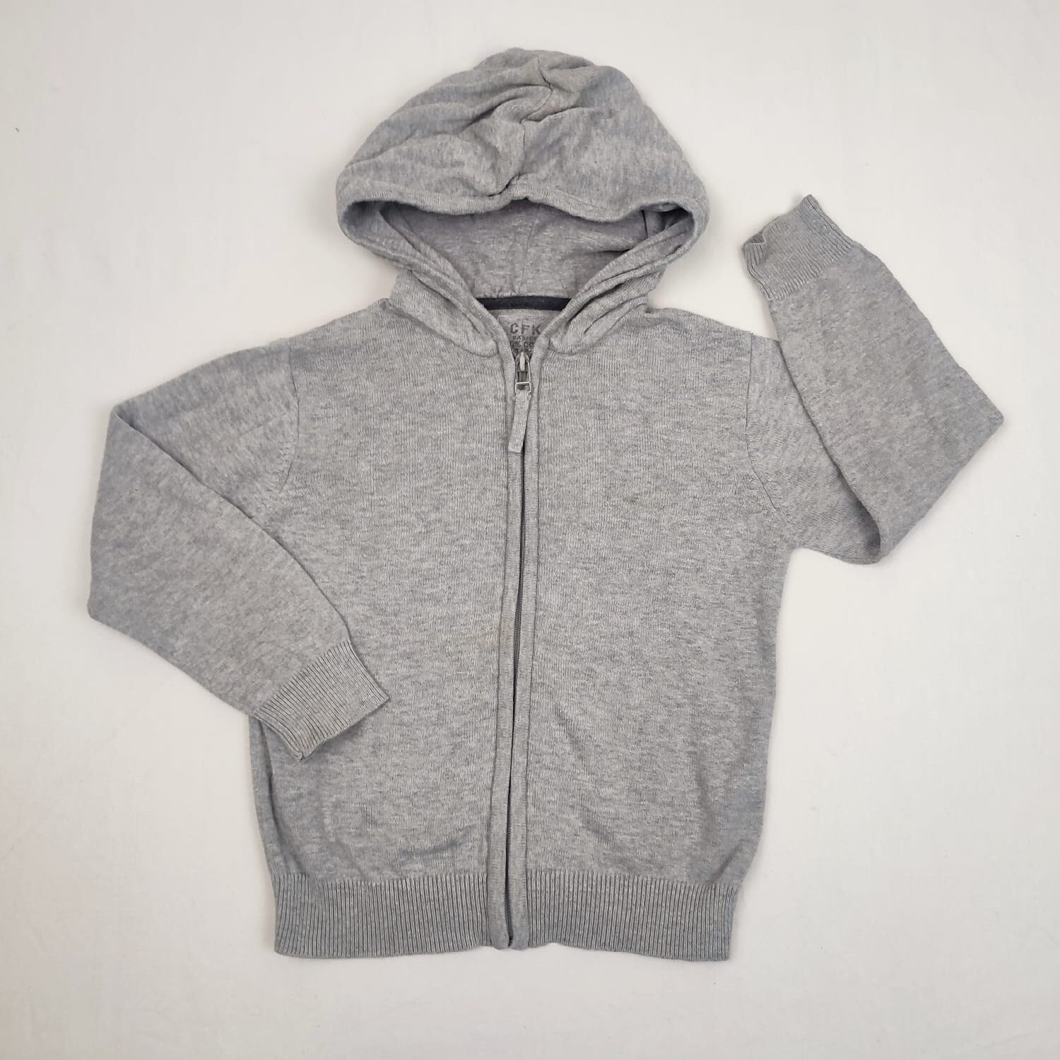 Autres commentaires : Gilet à capuche manches longues en maille grise, capuche doublée en jersey gris, fermeture par zip devant, un tout petit peu jauni au niveau de la capuche.