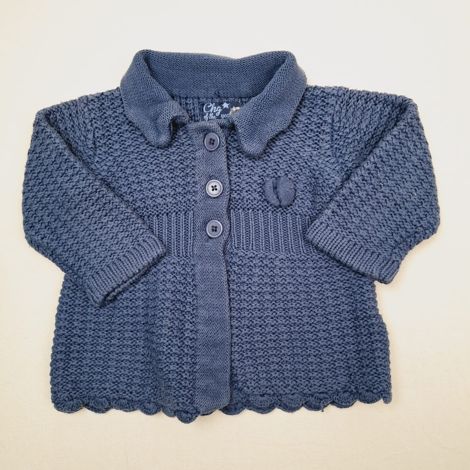 Autres commentaires : 50% acrylique. Gilet cardigan bleu, fermeture par boutons, col Claudine.