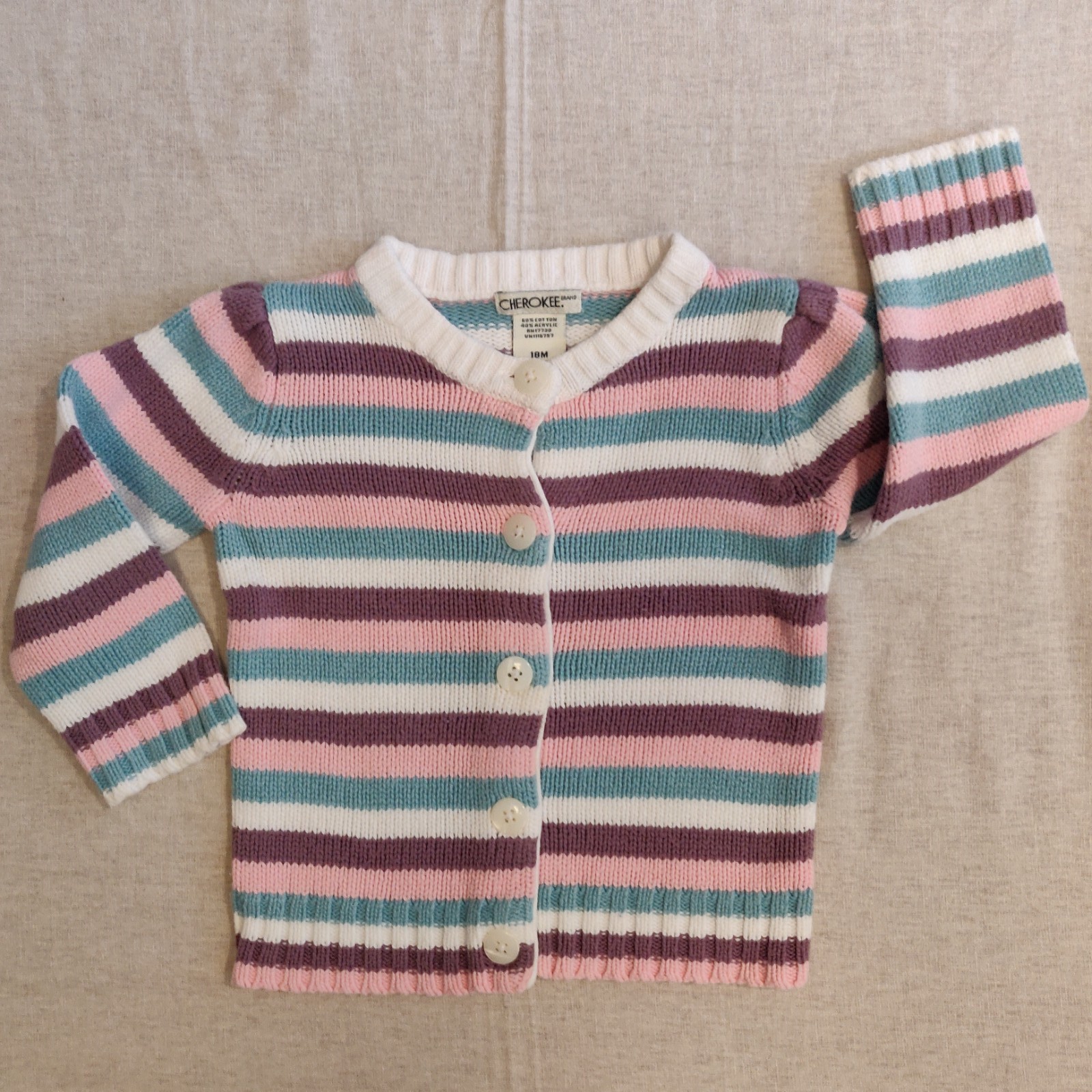 Autres commentaires : 40% Acrylique. Gilet col rond, blanc à rayures roses, bleu clair et violettes. Fermeture par 5 boutons.