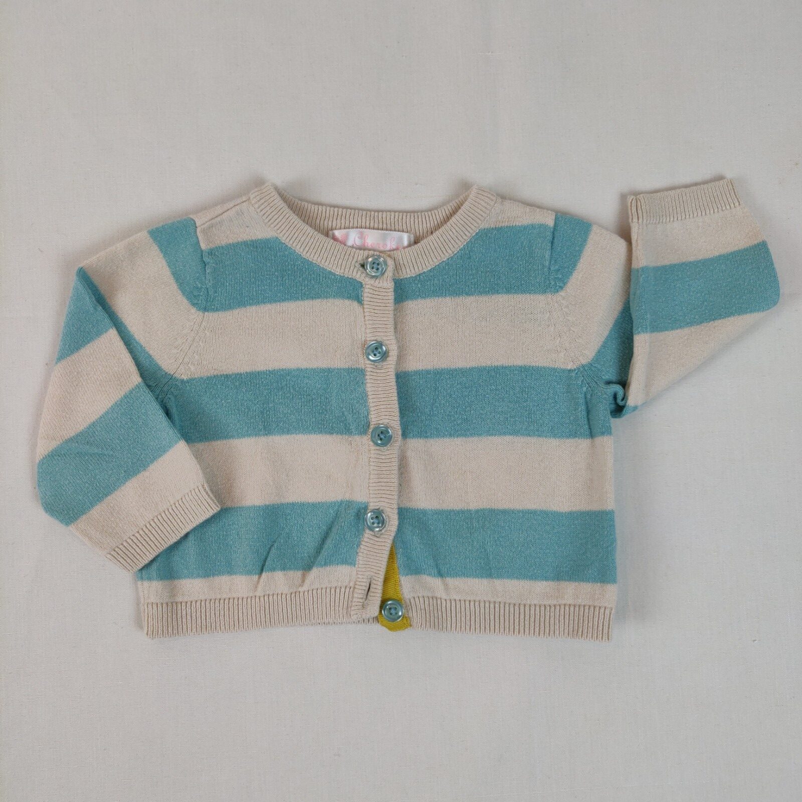 Autres commentaires : Gilet rayé écru et bleu marine – ouverture centrale à boutons classiques nacrés. Léger effet pelucheux.