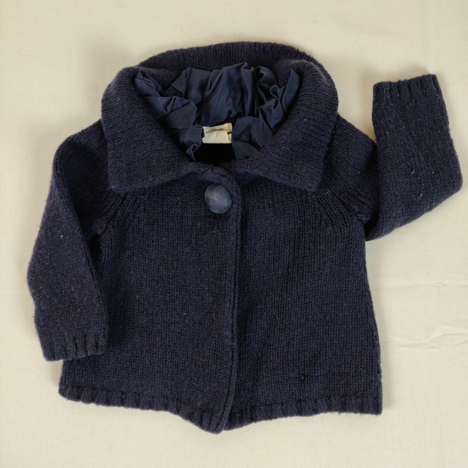 Autres commentaires : Gilet en maille – bleu marine avec col doublé d’une collerette froncée bleu-marine. Ouverture à un bouton classique.