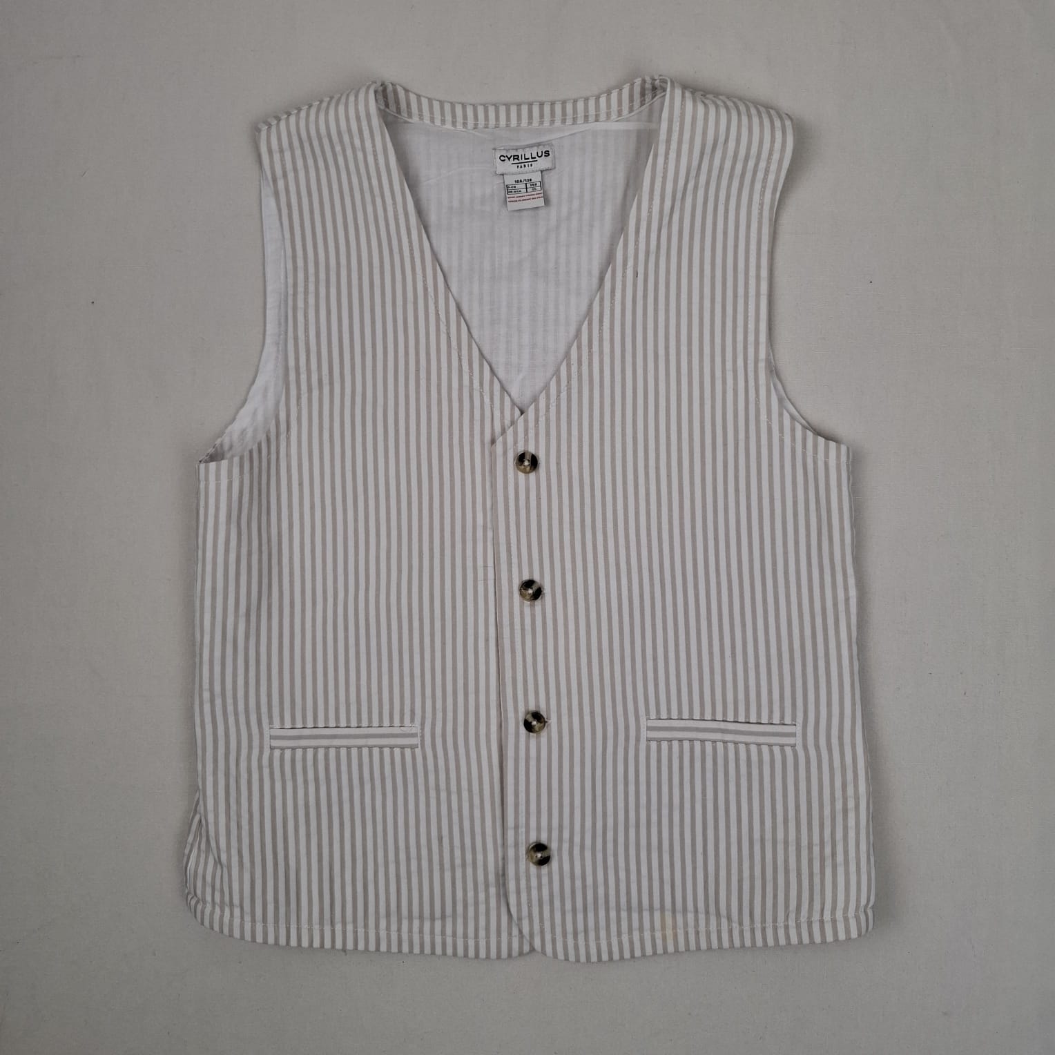 Autres commentaires : Gilet sans manches à rayures beiges et blanches, col V, fausses poches devant, fermeture devant par boutons, idéal pour une cérémonie ou fête.