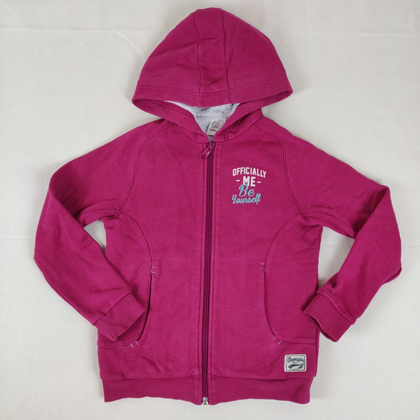 Autres commentaires : 45% polyester. Gilet doublé en fourrure synthétique esprit sweat à capuche – rose – ouverture centrale à fermeture éclair. 2 poches latérales. Inscriptions centrales blanche et bleue « Officially me – Be yourself ».