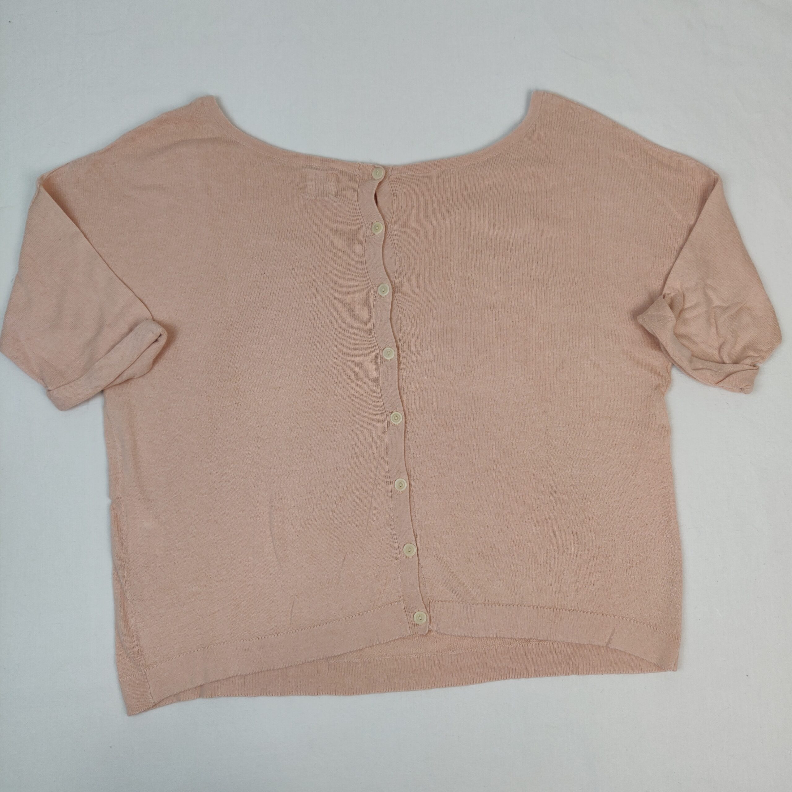 Autres commentaires : 5% viscose, 5% soie. Pull en maille, très fin à manches courtes avec revers, beige rosé, fermeture par boutons dans le dos, col bateau. Minuscules peluches d’usure. Déclassé de melon à banane.
