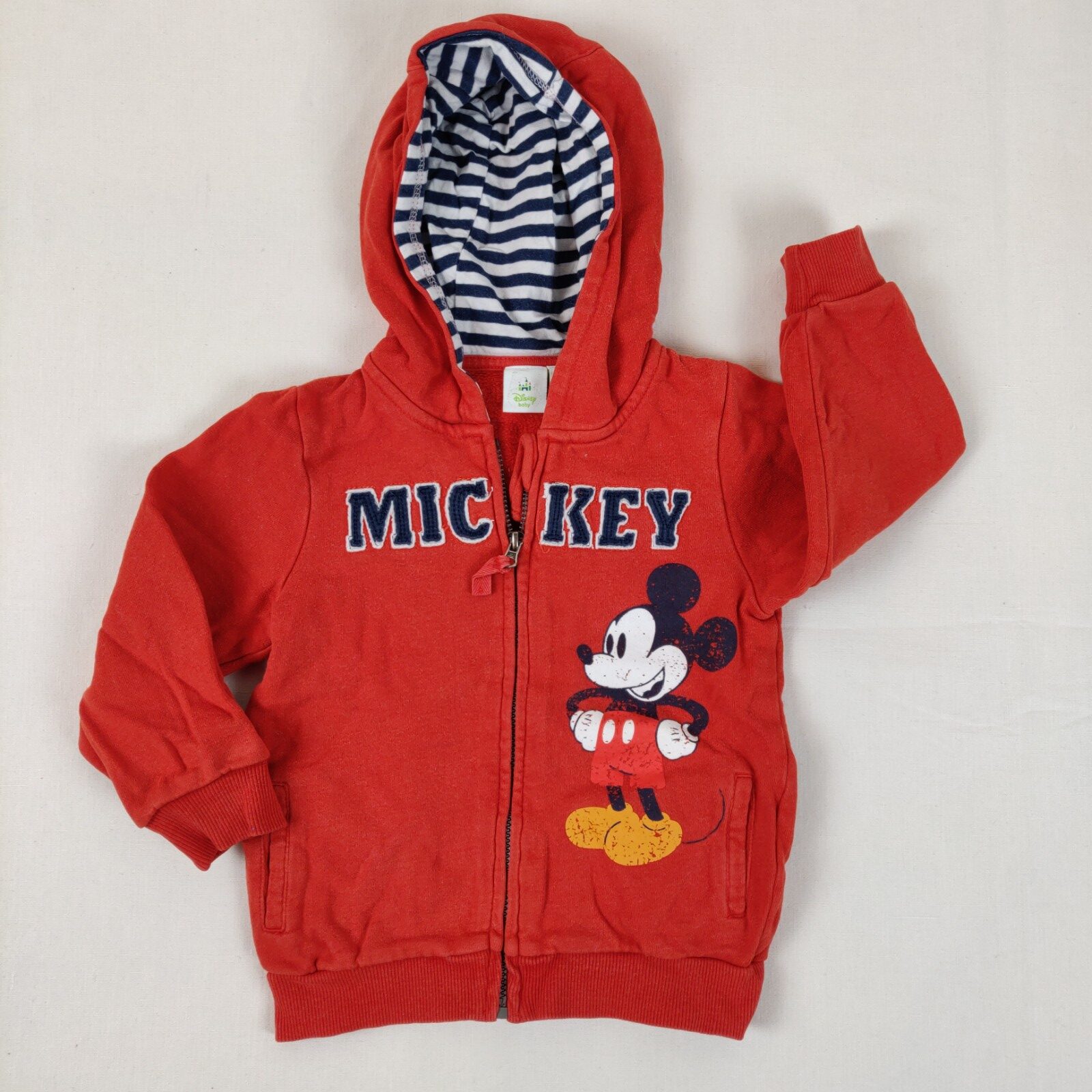 Autres commentaires : Gilet à capuche – orange avec motif central un peu craquelé Mickey accompagné de l’inscription « Mickey ». 2 poches latérales. Ouverture centrale zippée.