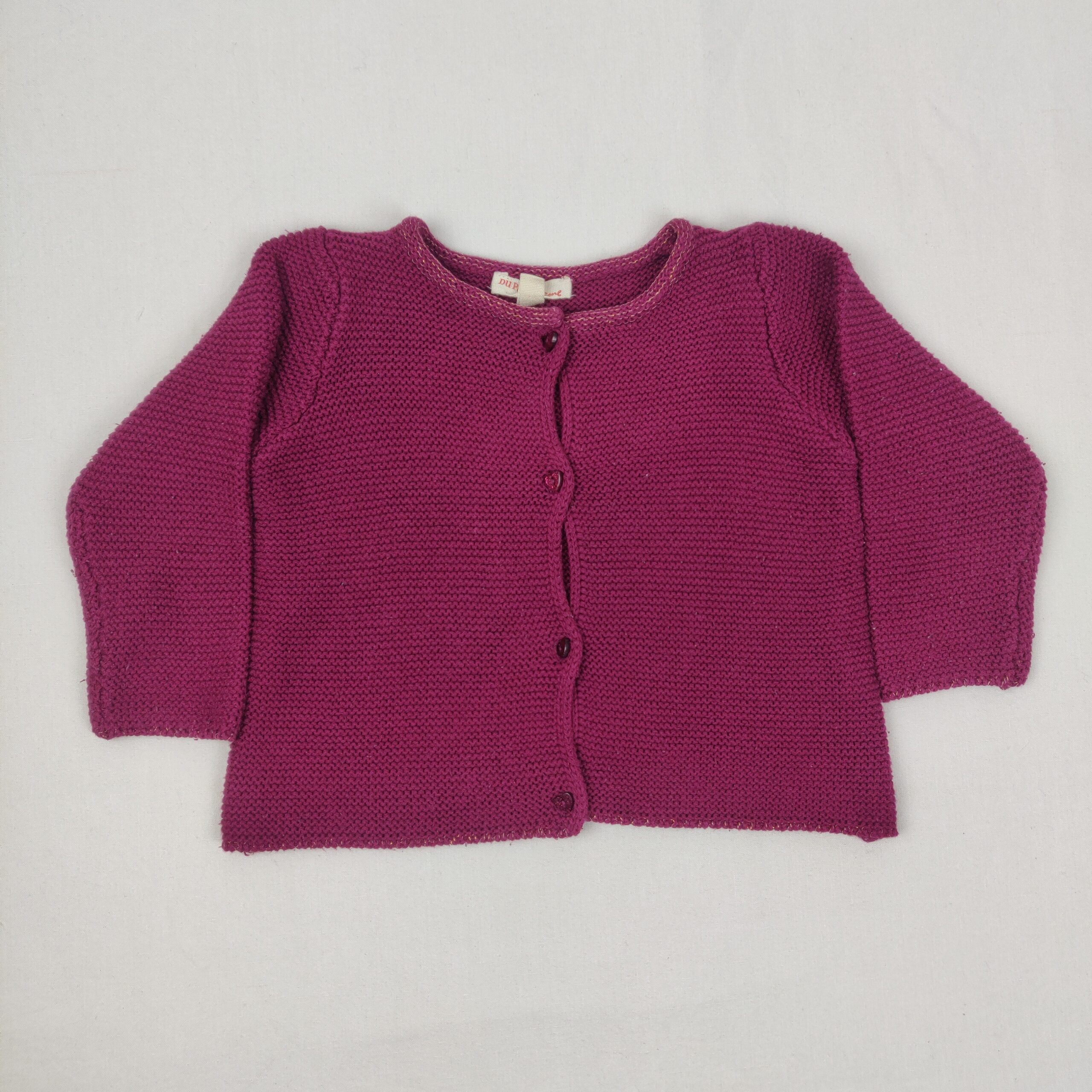Autres commentaires : Cardigan lie de vin en point mousse avec fils dorés au cou et aux poignets. Boutons en forme de coeur.