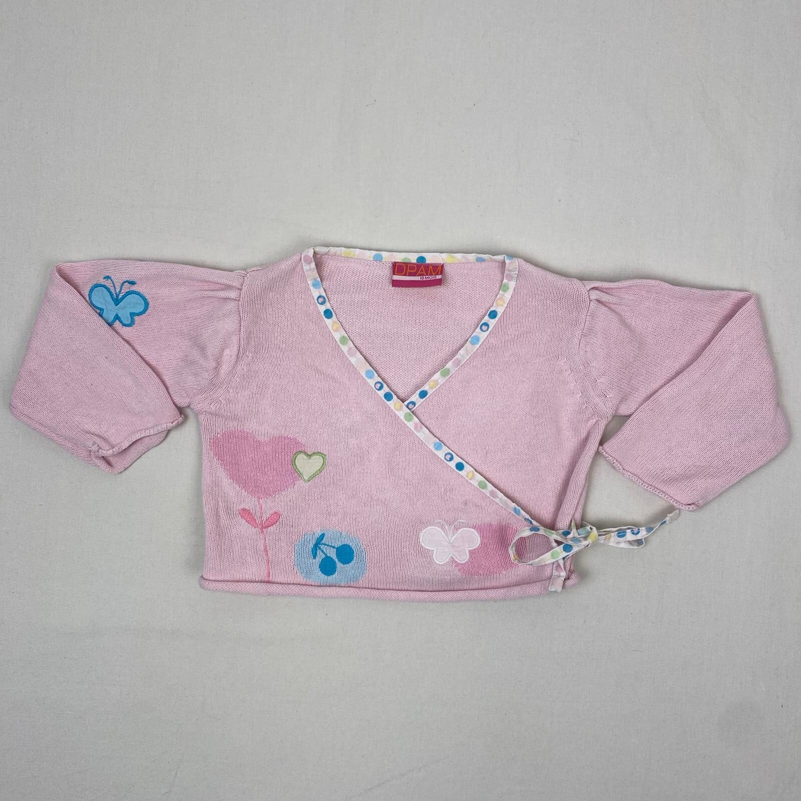 Autres commentaires : Gilet rose clair à manches logues avec des motifs de papillons brodés, col cache coeur, fermeture par lanières