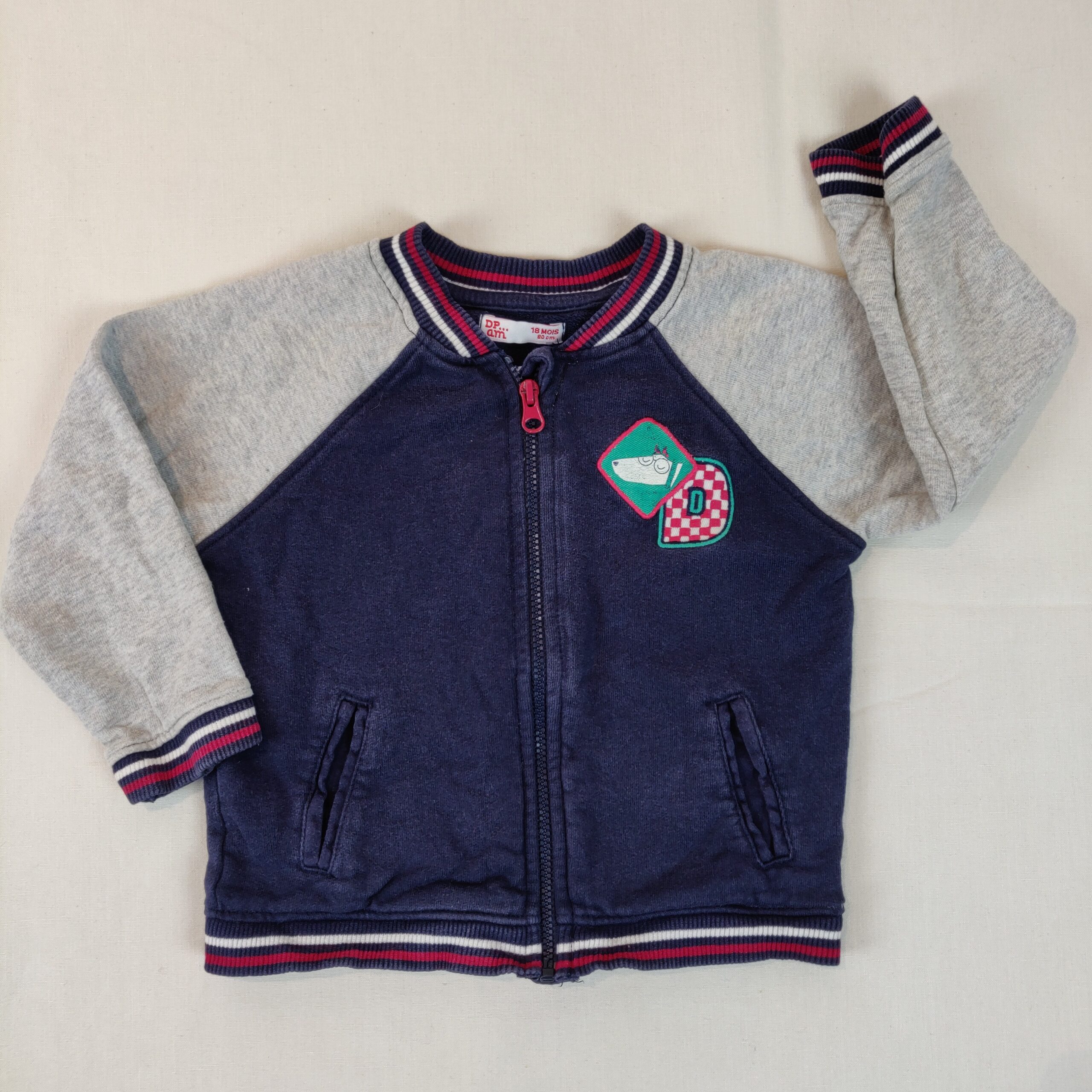 Autres commentaires : Gilet – bleu marine à manches gris chiné – ouverture centrale à fermeture éclair. Col, poignets et tailles élastiques façon tricot bleu marine avec bandes blanche et rouge. Motif canin vert et rouge central. 2 poches latérales. Usure normale du vêtement.