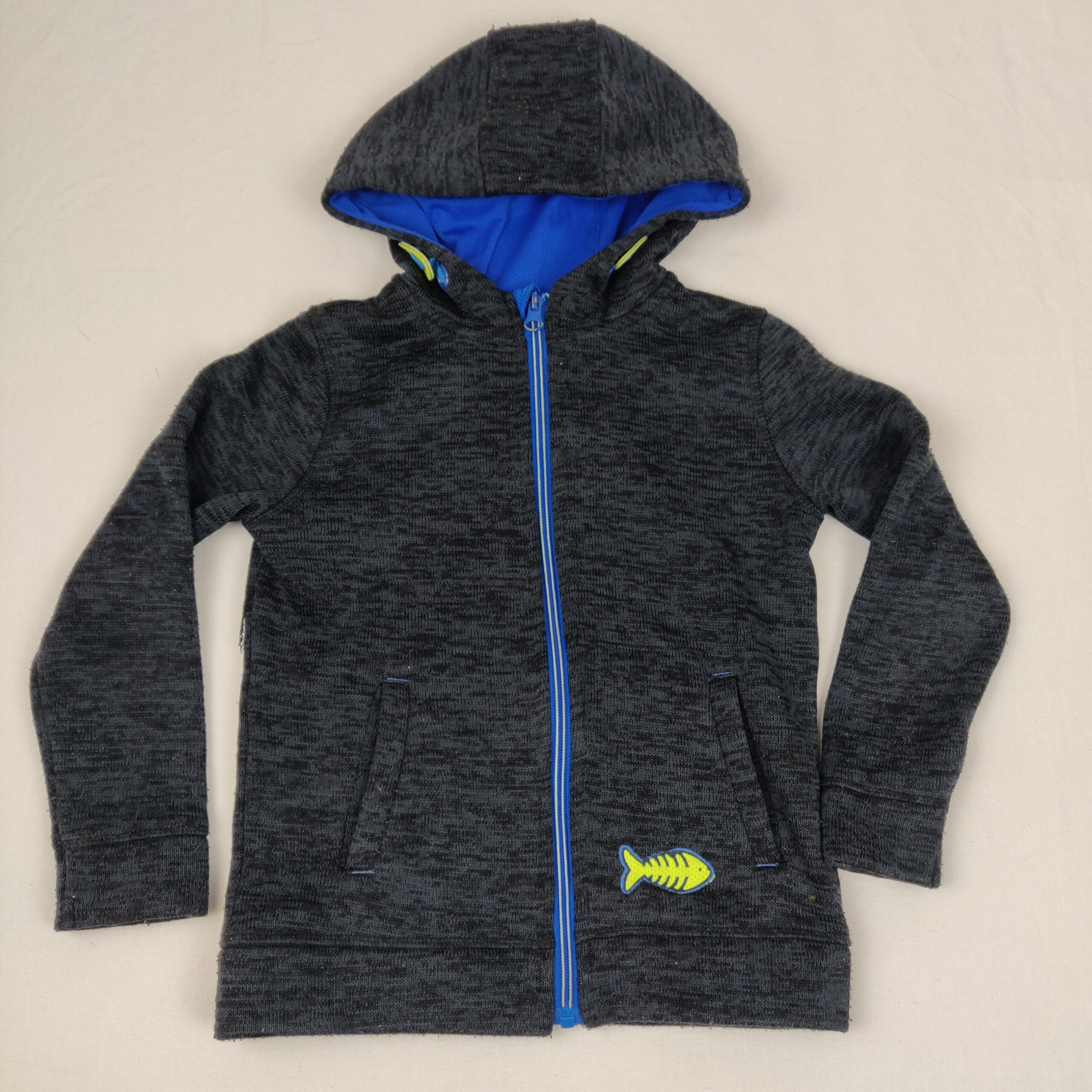 Autres commentaires : Gilet sweat gris foncé chiné noir, en 100% polyester à capuche doublée bleue, fermeture éclair bleu électrique et petit poisson jaune fluo en bas – bouloches d’usure sur le bas – niveau Fraise réduit à Myrtille