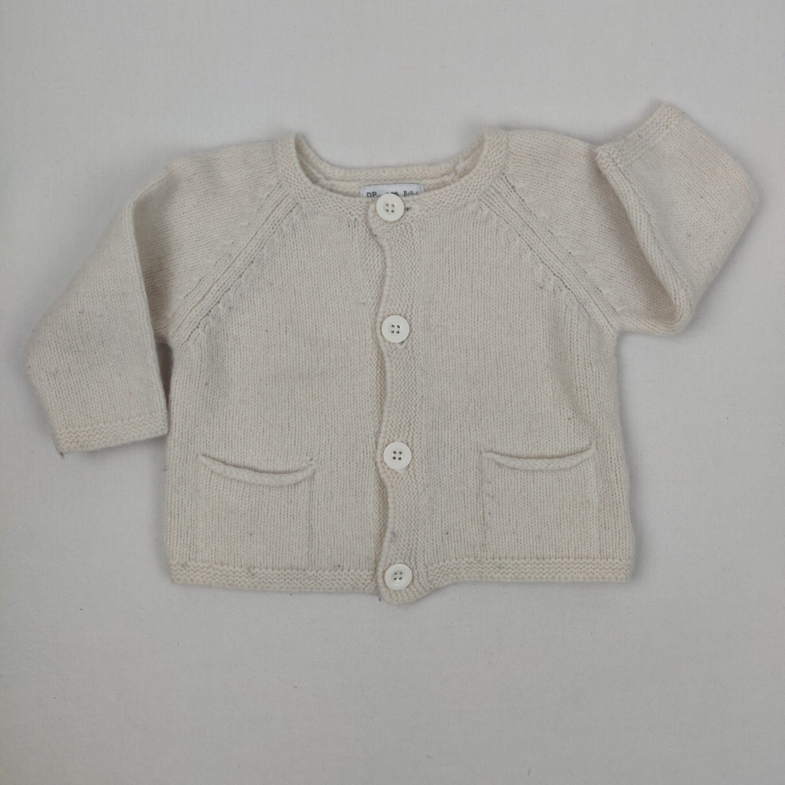 Autres commentaires : Gilet en laine à 70%, 20% Angora et 10% nylon, couleur crème, bordure du bas et des poignets en point mousse, fermeture complète devant par boutons classiques ton-sur-ton, quelques petites bouloches d’usage.