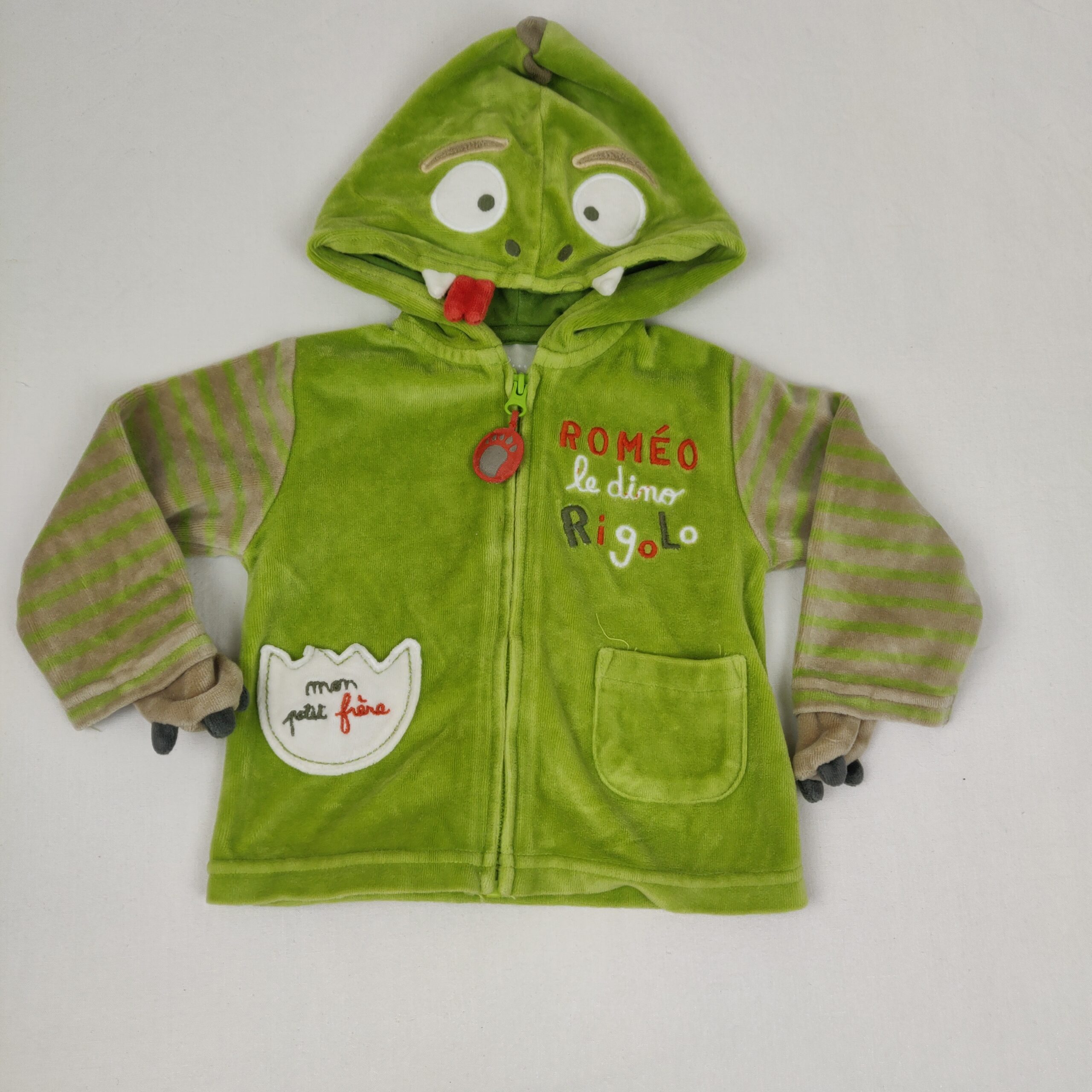 Autres commentaires : 20% polyester, gilet à capuche, doublure capuche en jersey 100% coton, fermeture par zip, motif tête et queue de dinosaure, inscription « Roméo le dino Rigolo »