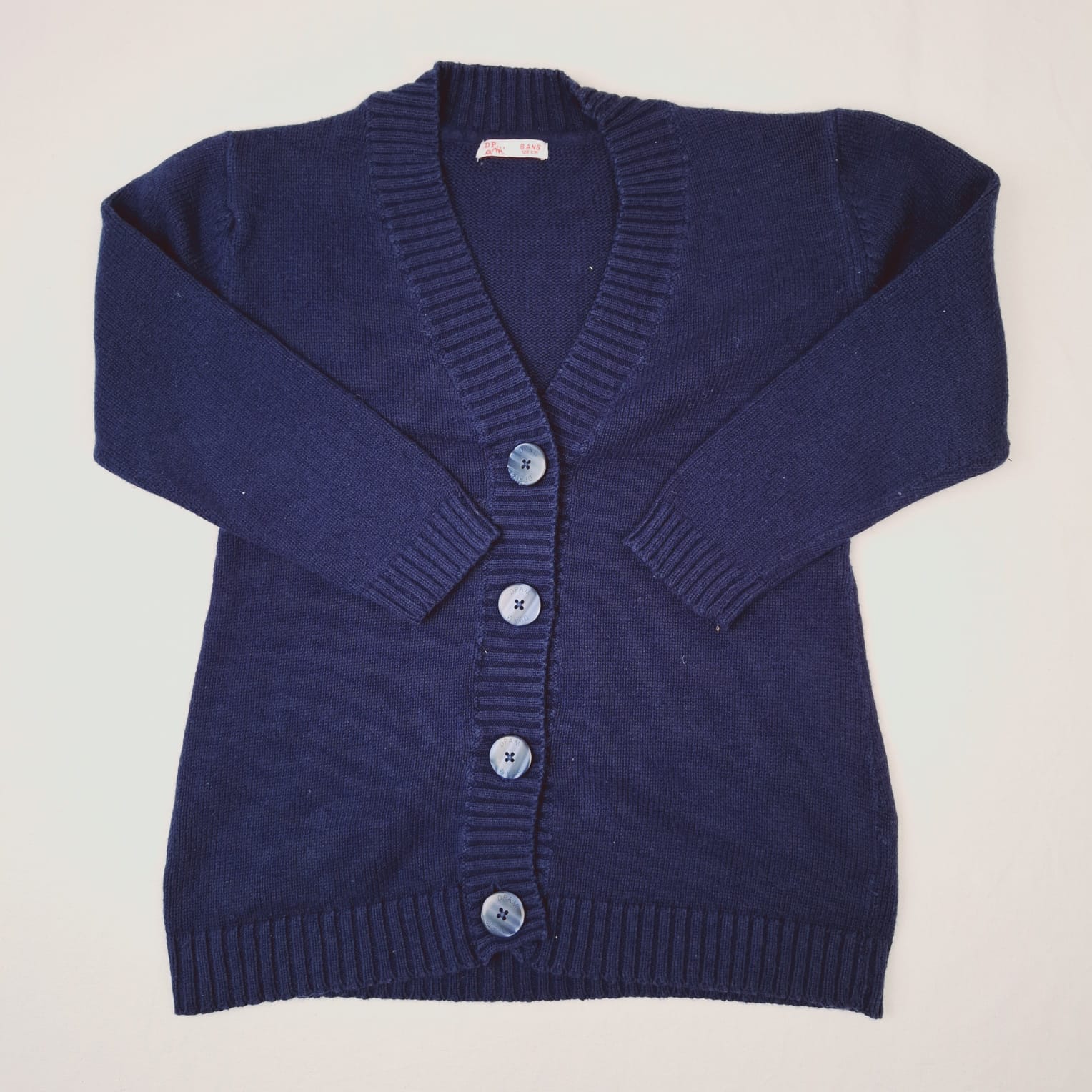 Autres commentaires : 30% nylon. Gilet en mailles bleu foncé, fermeture par boutons, encolure en V et poignets en finition bord-côte.