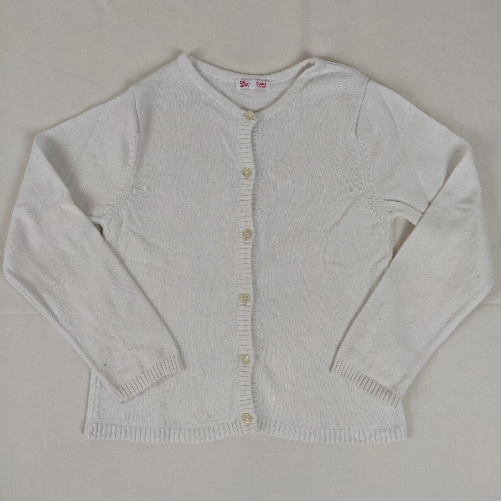 Autres commentaires : 35% viscose, 20% nylon, 5% angora. Gilet à manches longues – écru – ouverture centrale à boutons classiques nacrés (1 bouton supplémentaire fourni).