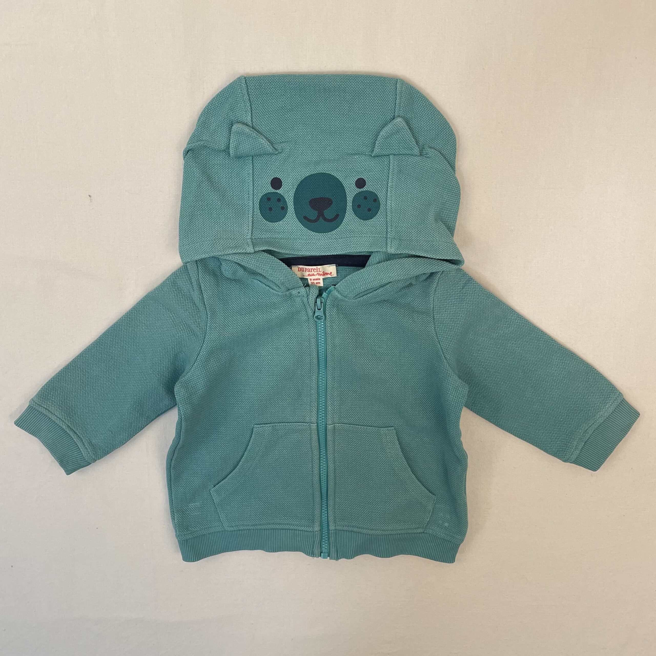 - Gilet zippé, en maille piquée turquoise, capuche avec motif tête d’ours sur le dessus avec petites oreilles en relief.