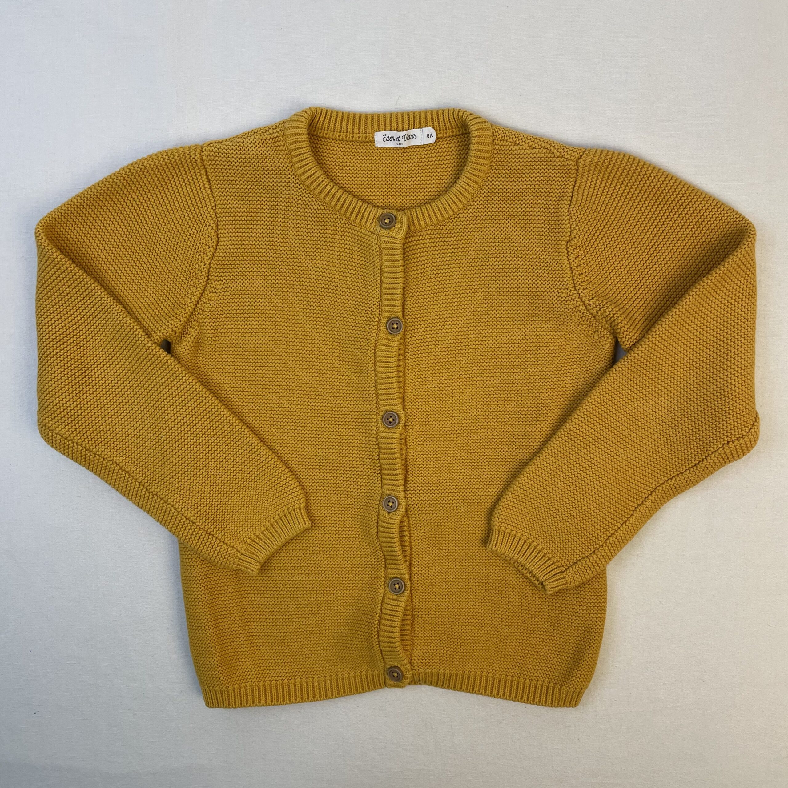 - Gilet épais en point mousse jaune ocre, fermeture devant par boutons classiques.