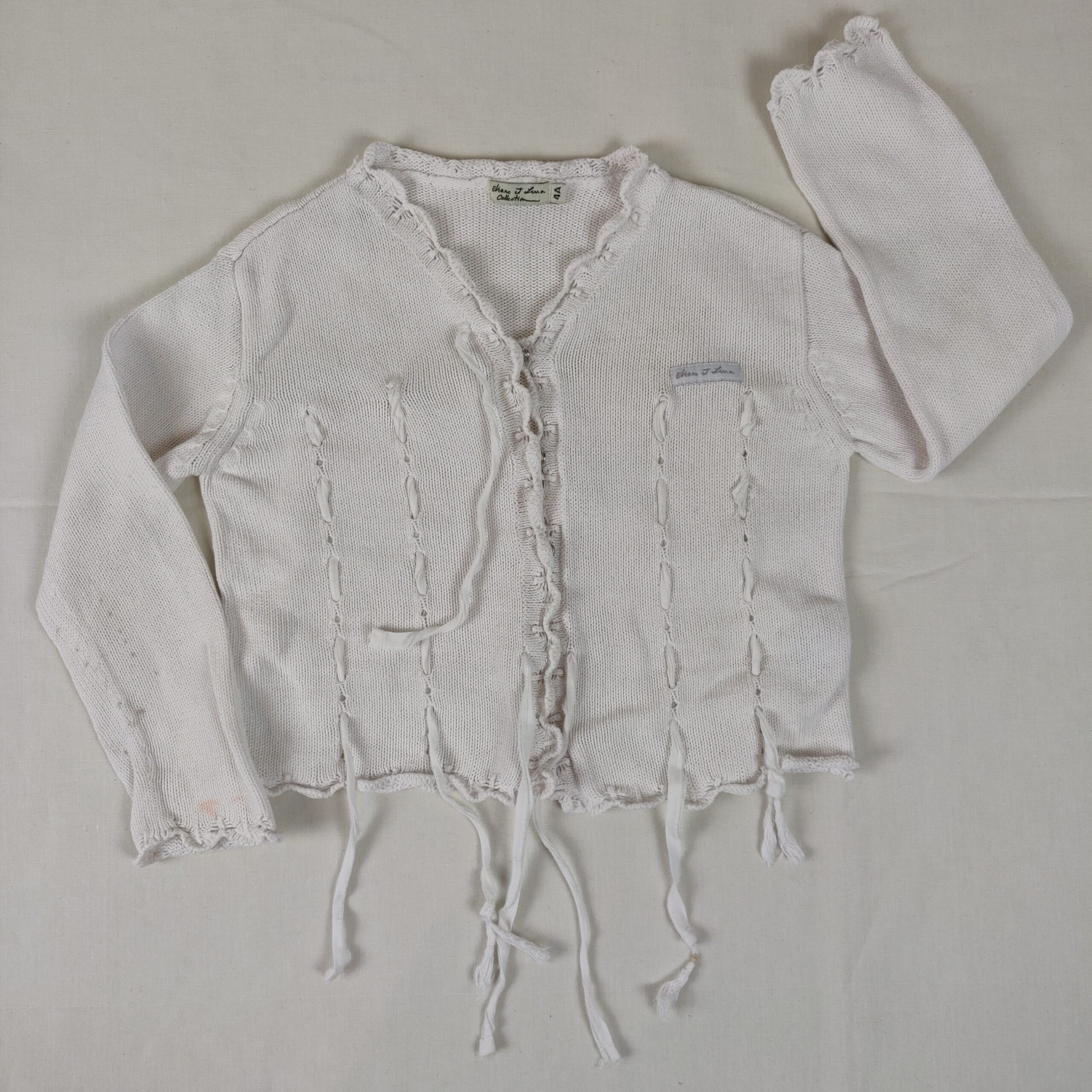 Autres commentaires : Gilet blanc avec col et ouverture travaillés façon broderie. 4 lignes verticales avec inserts en tissu blanc sur le devant. Boutons pression. Petite tâche orange à l’arrière du poignet et très lègères tâches grisées à l’arrière de la manche.