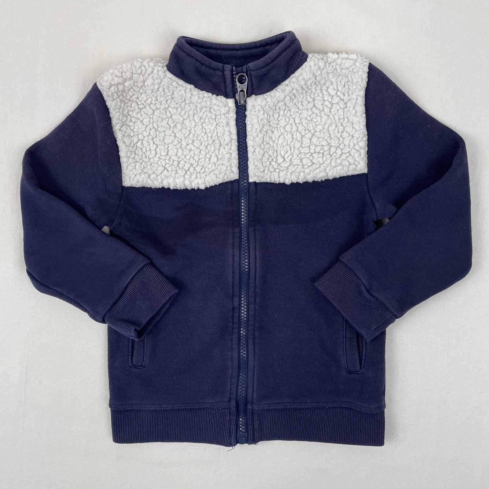 35% polyester.Gilet bleu marine col cheminée avec fermeture par zip et moumoute sur le haut.