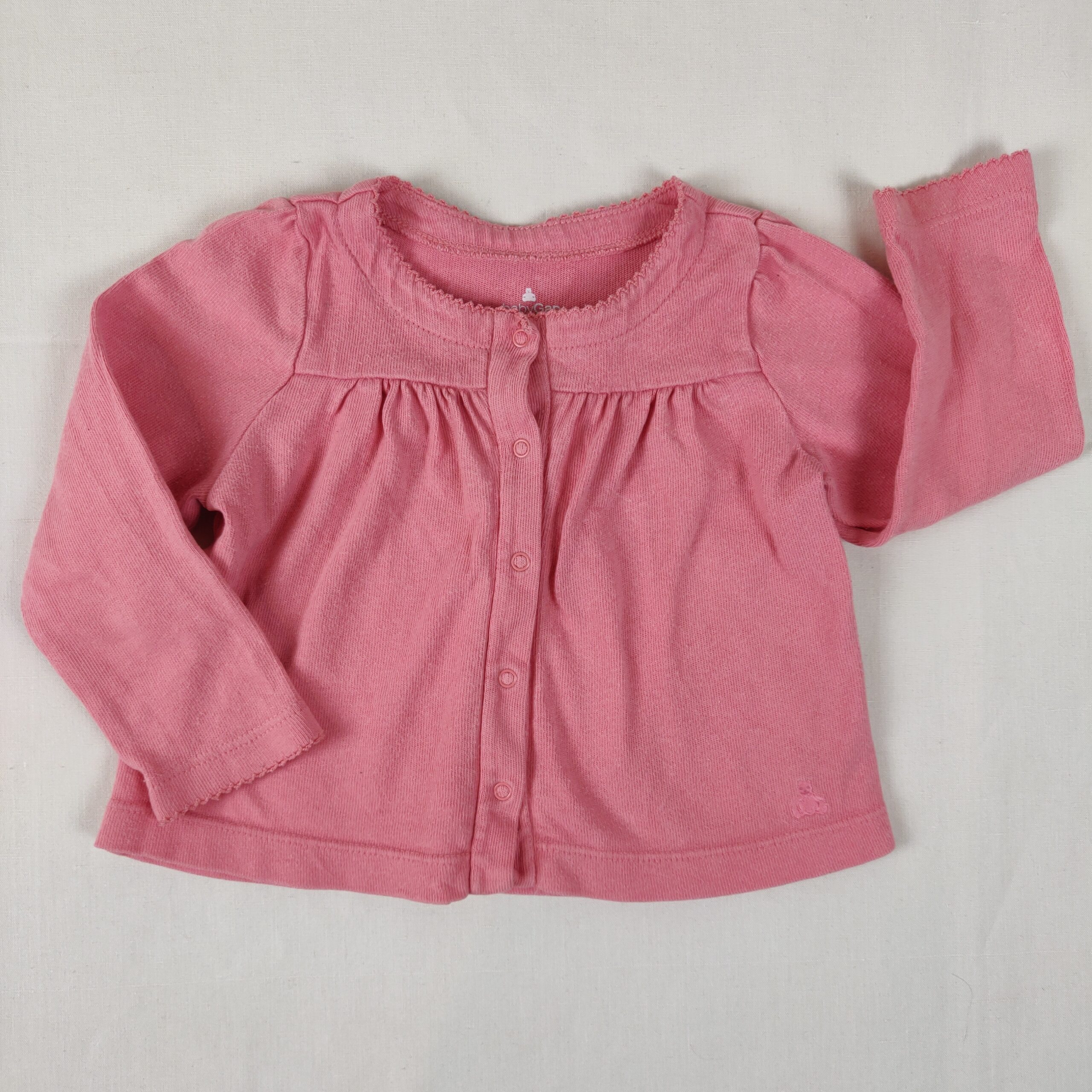 Autres commentaires : Cardigan en maille rose corail, fronces à l’avant et à l’arrière, fermeture par boutons pression.
