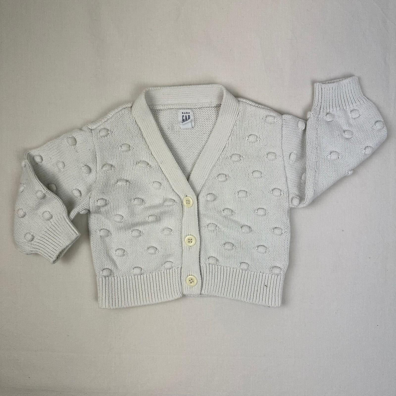 Autres commentaires : Gilet manches longues blanc, col V et une fermeture par boutons.