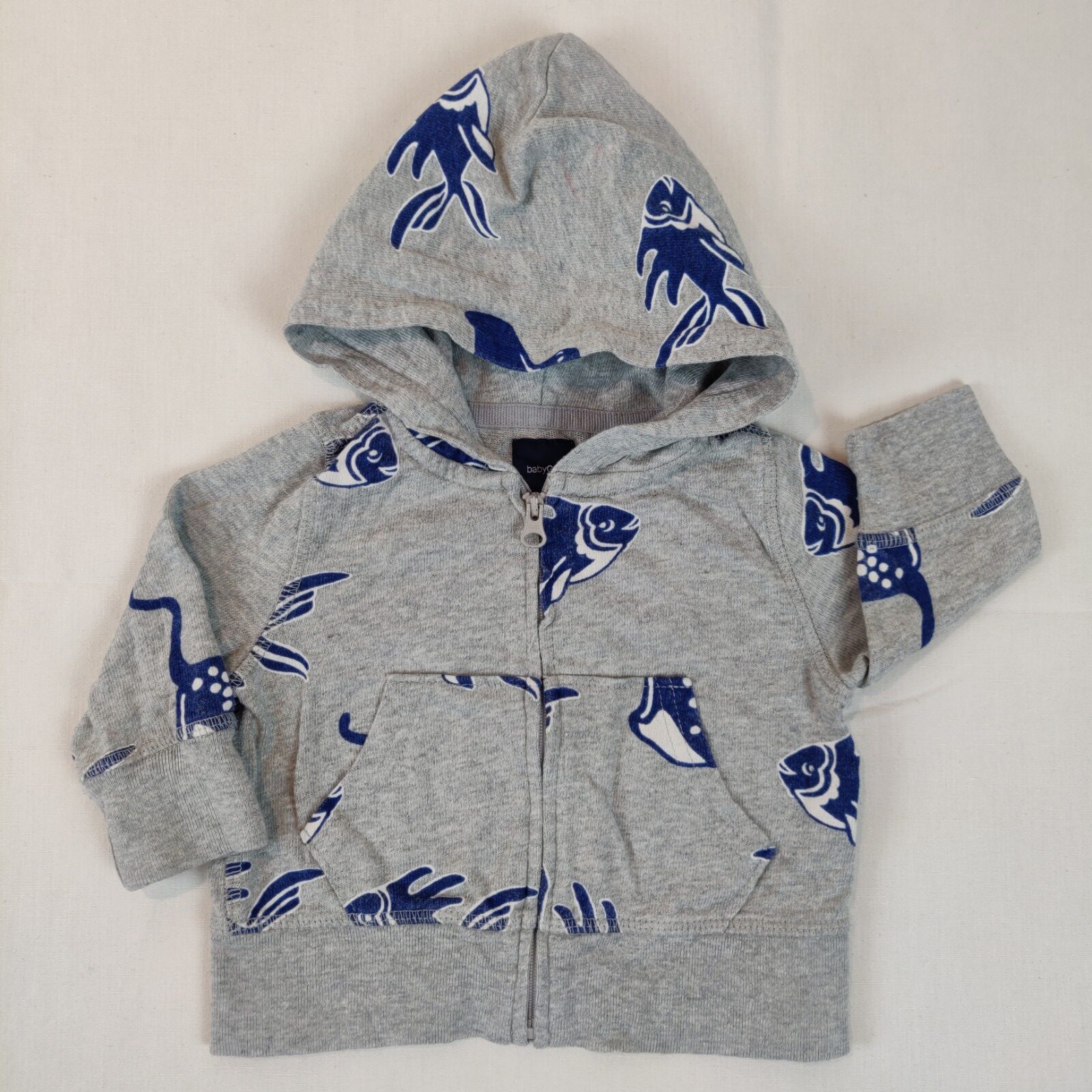 Autres commentaires : Gilet à capuche – gris chiné avec motifs poissons blancs et bleus se répétant. Ouverture centrale à fermeture éclair. 2 poches latérales.