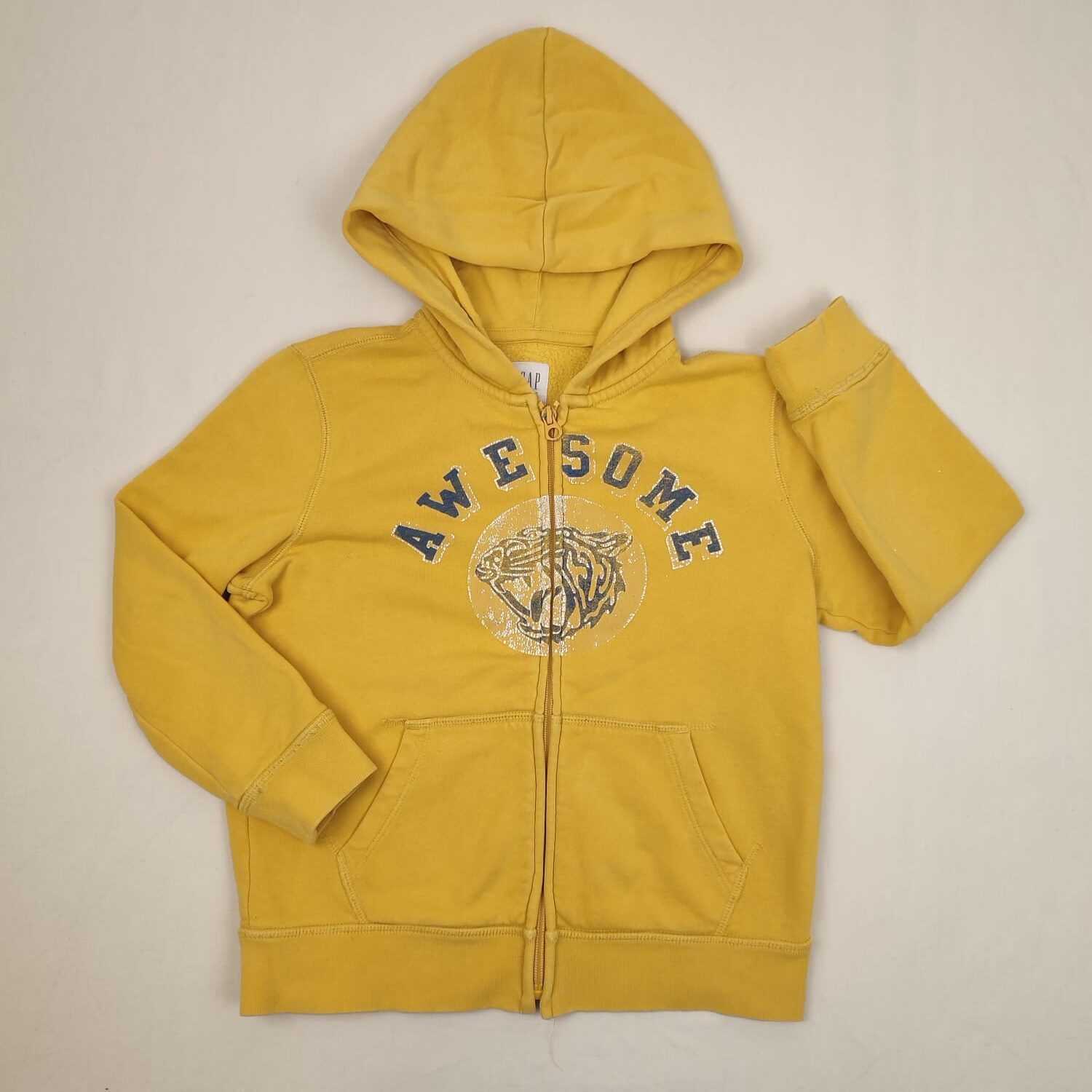 Autres commentaires : 23% polyester. Gilet-sweat zippé jaune à capuche doublée 100% coton, bordures côtelées, inscription « AWESOME » en gris et motif tigre sur le devant, double poche ventrale.