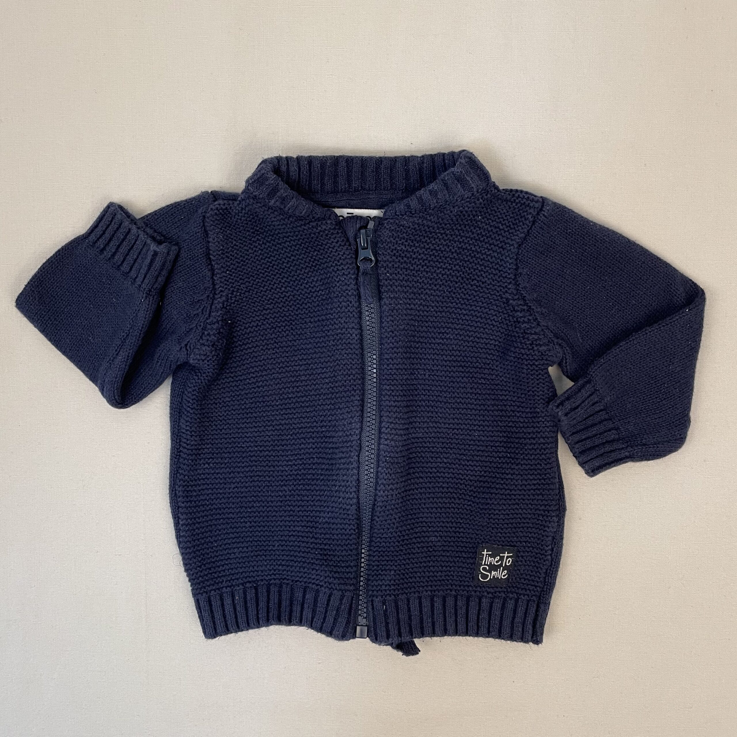 - Gilet zippé devant, en tricot gris bleu marine.