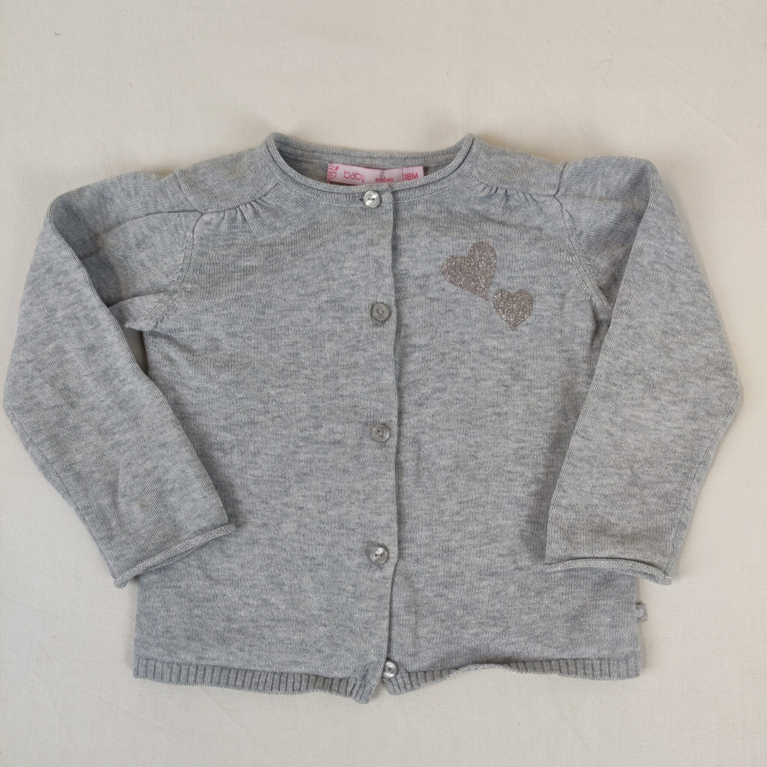 Autres commentaires : Gilet – gris chiné. Motifs centraux coeurs roses pailletés. Ouverture centrale à boutons. Très discrète tâche marron clair au niveau de l’épaule droite.