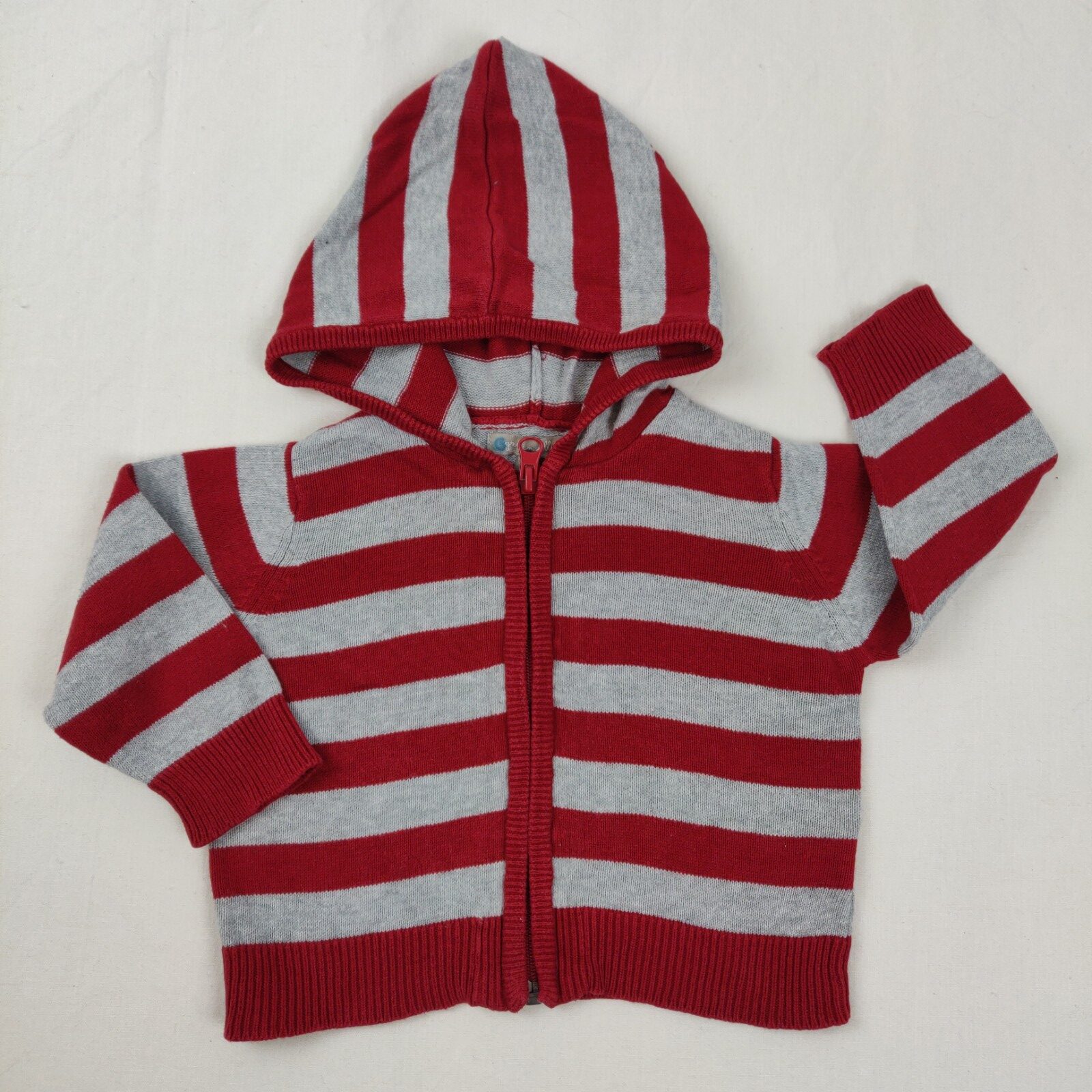 Autres commentaires : Gilet gris manches longues avec capuche et rayures rouges et une fermeture en zip.